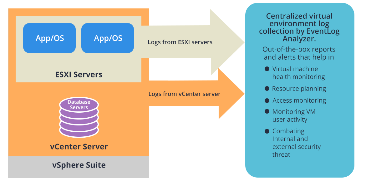 当今公司中最受欢迎的虚拟平台是VMware,EventLog Analyzer监控VMware的每个组件,从单个ESXi设备到vCenter服务器。