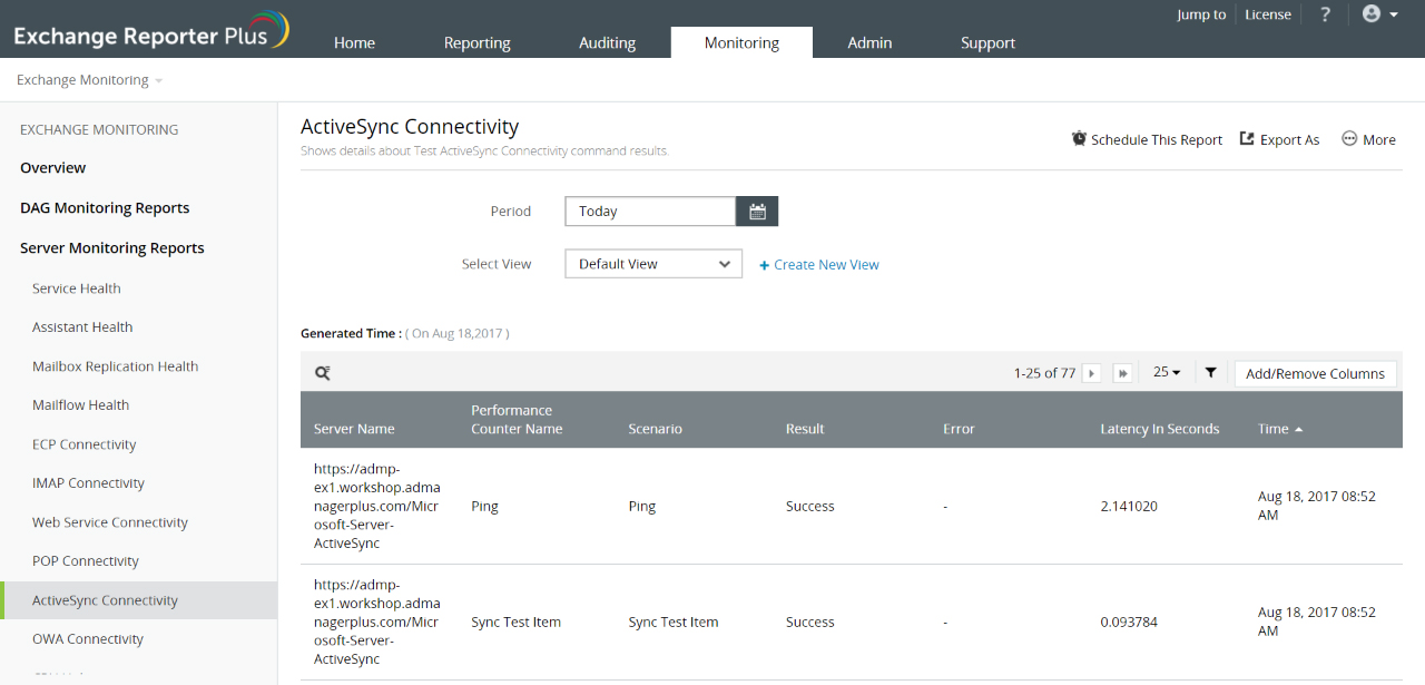 您可以通过配置Exchange测试邮箱并运行测试连接状态的PowerShell脚本来检查连通性。Exchange Reporter Plus使用系统生成的测试用户邮箱 -extest,从而无需因为运行这些测试而编写麻烦的脚本。