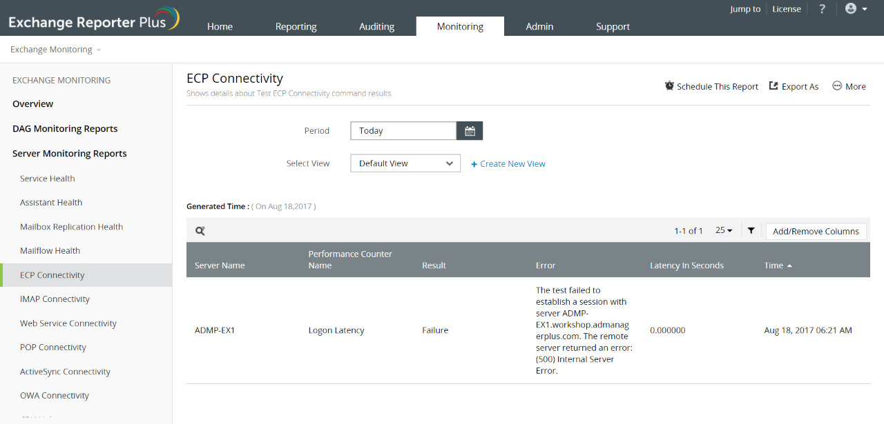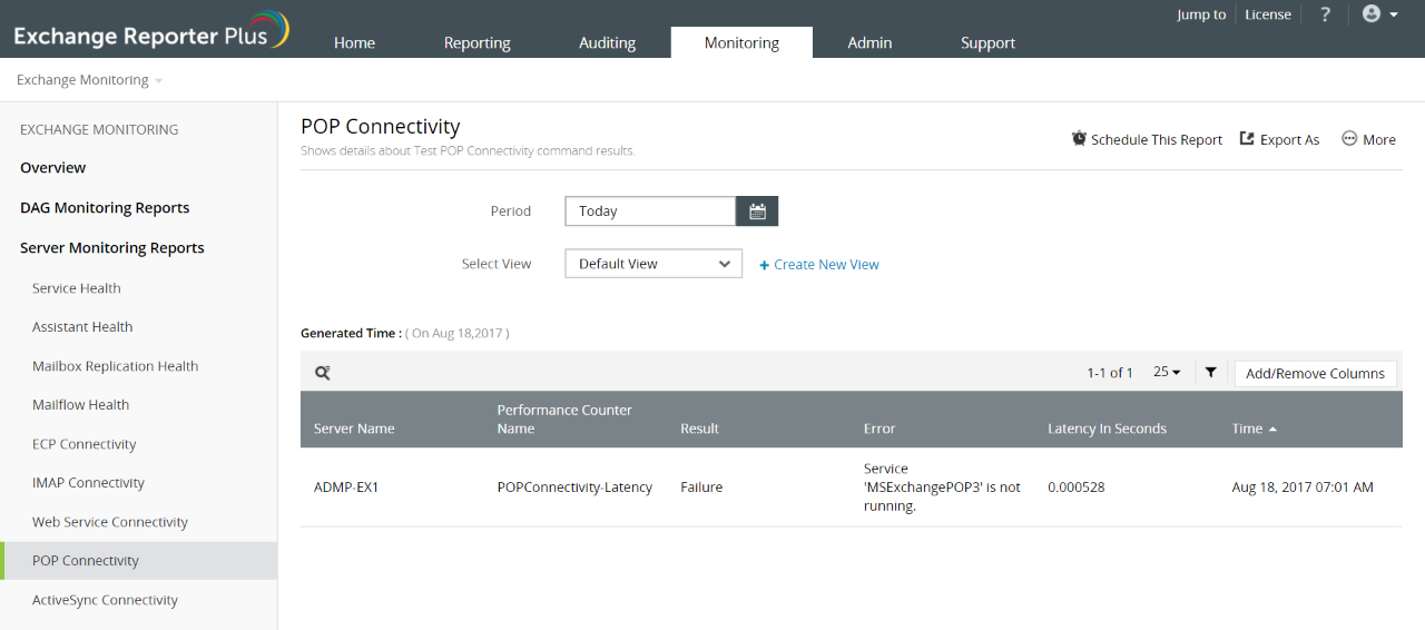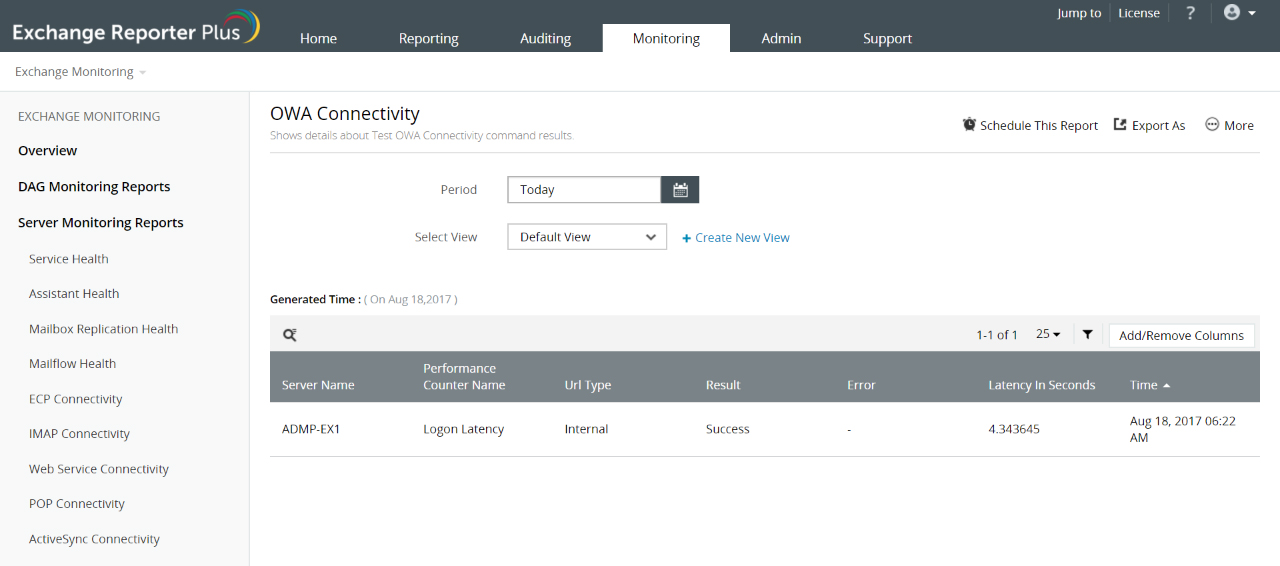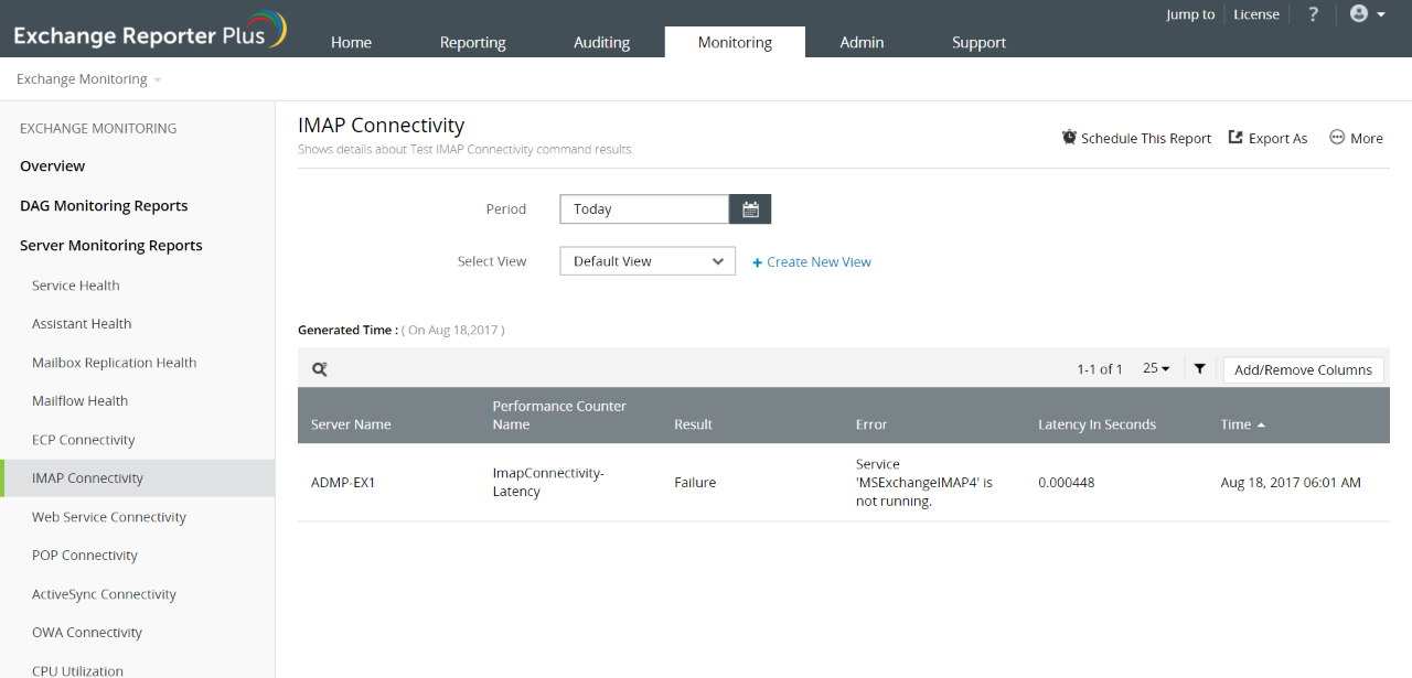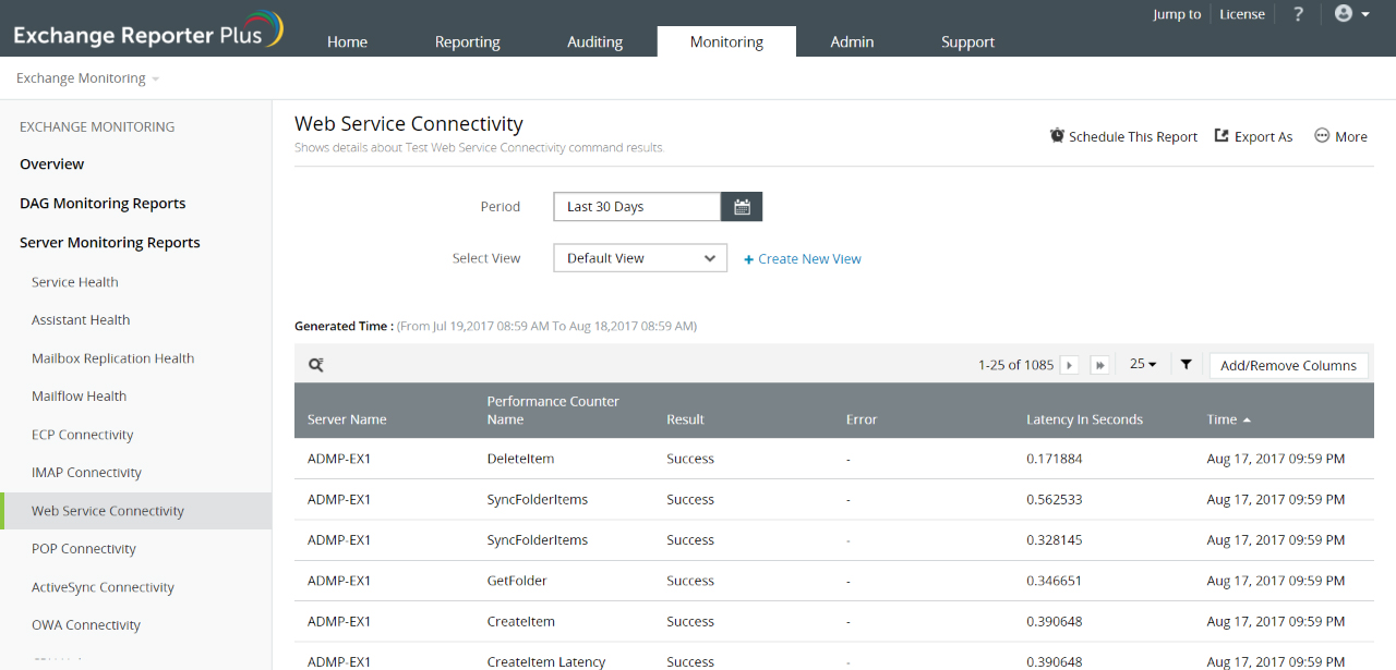 这个细粒度监测工具检查您的Exchange环境中的Exchange Server及其他组件或协议之间的连接并提供以下报表: