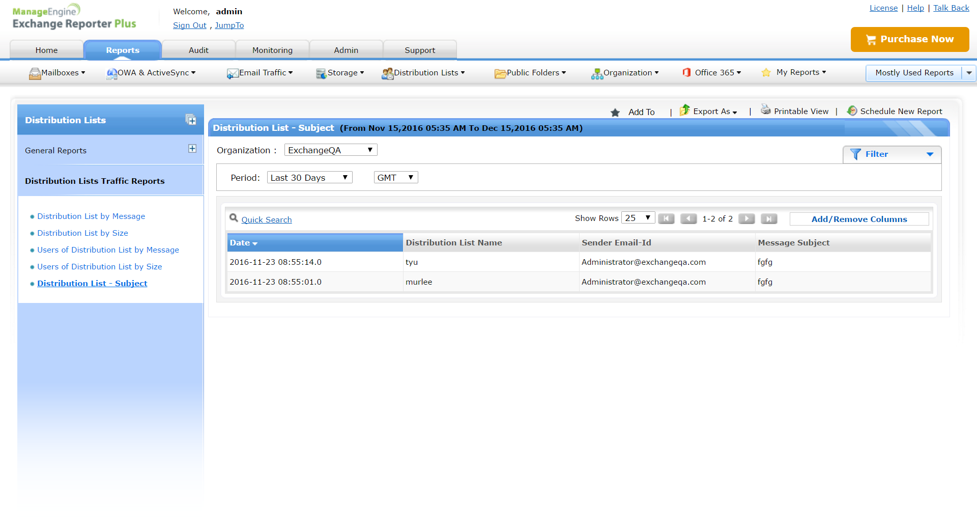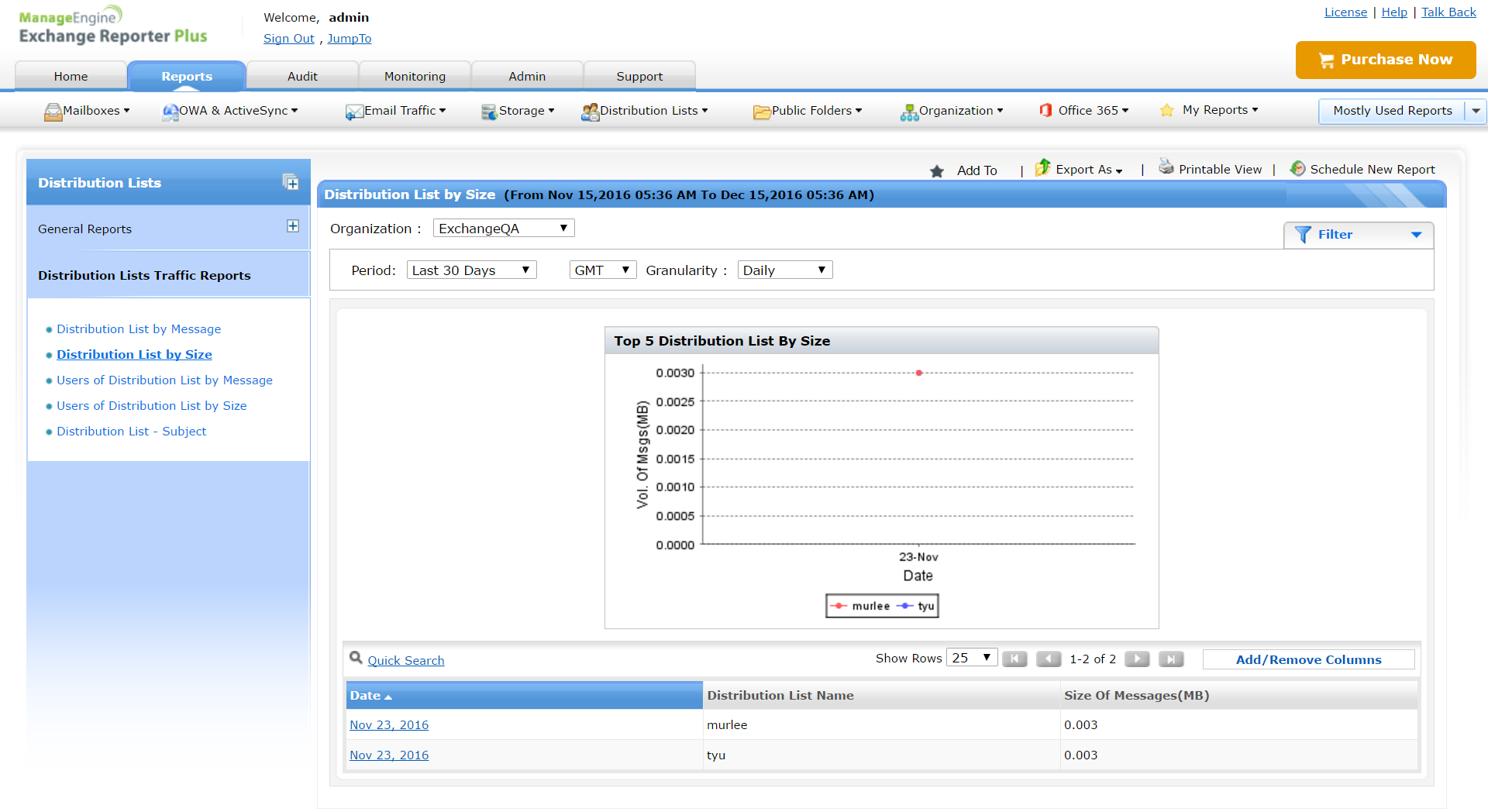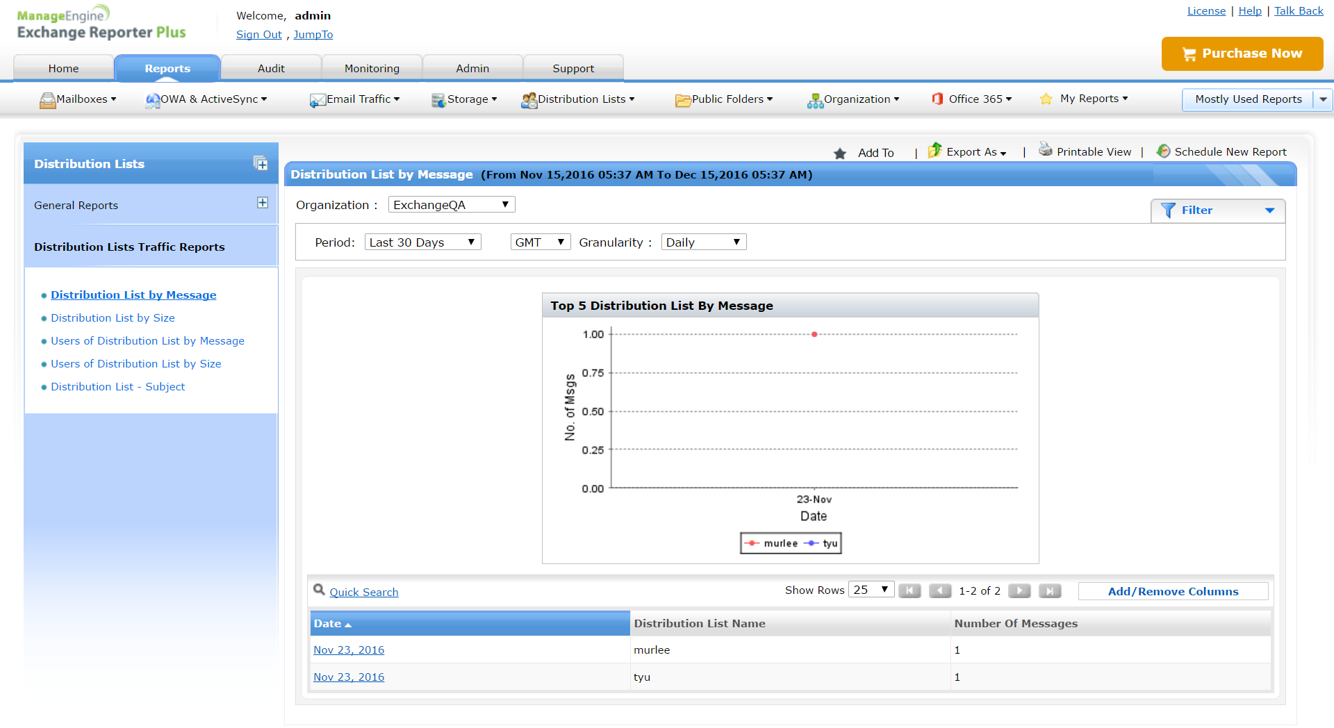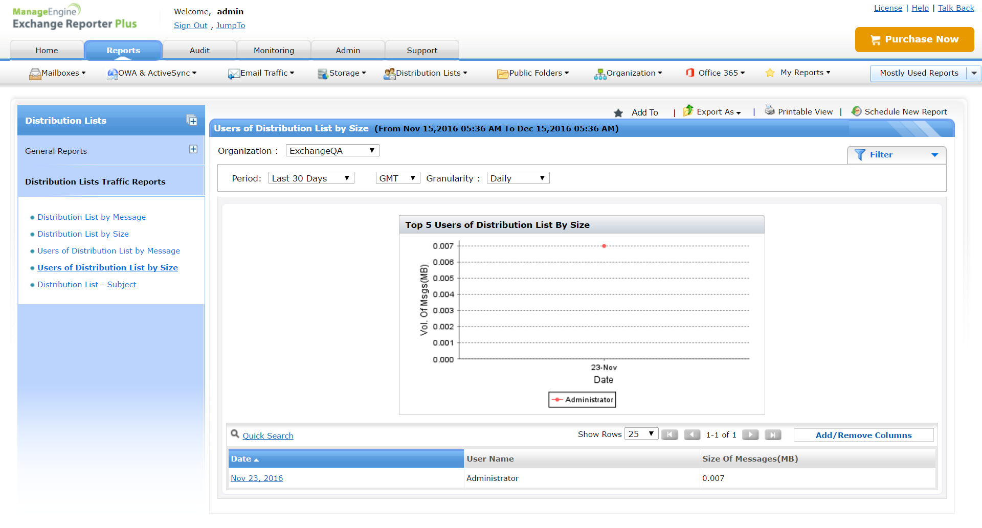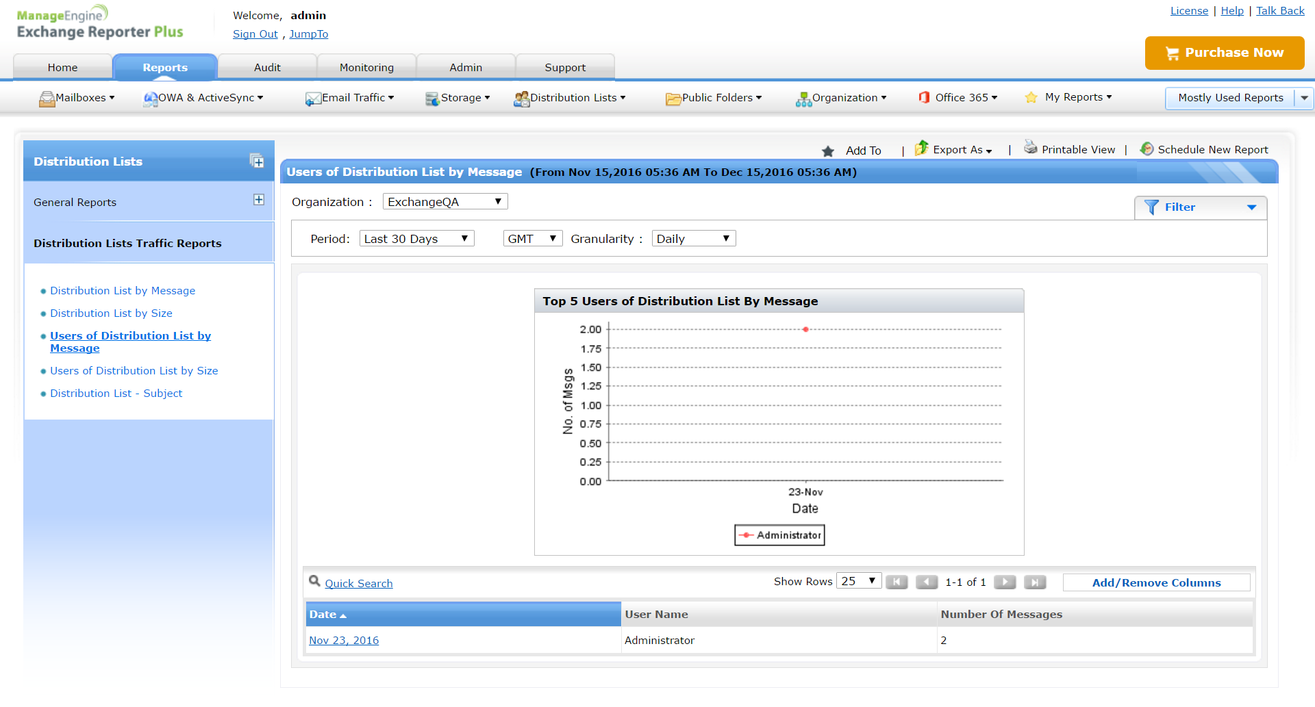 借助Exchange Reporter Plus的通讯组列表流量摘要报表,您可以识别组织中最繁忙的通讯组列表。您还可以轻松获取扩展服务器负载平衡所需的流量统计信息。这些报表可针对服务器版本2003、2007、2010、2013和2016进行配置。这些报表也可以CSV、PDF (Adobe Acrobat)、XLS (Excel)或HTML格式导出至目标文件夹。