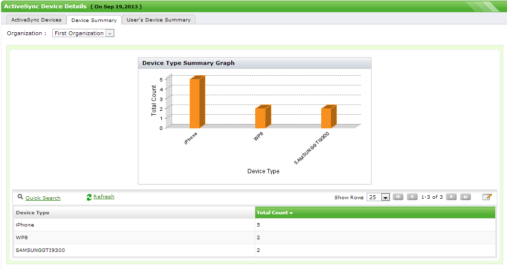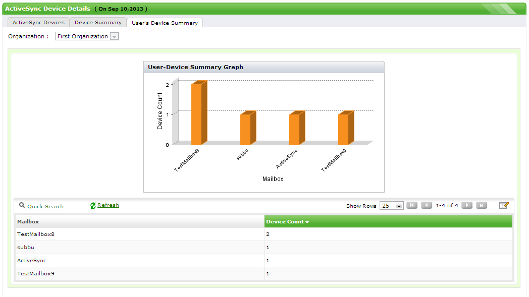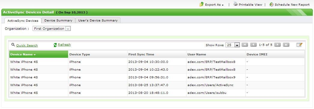 获取企业中所有ActiveSync设备的详细信息。使用本报表获取设备类型、计数和邮箱特定设备计数的摘要。