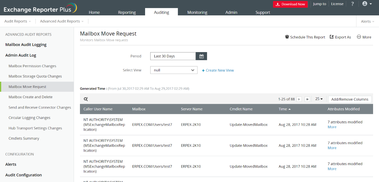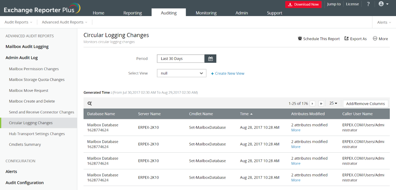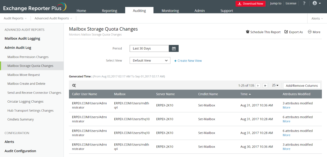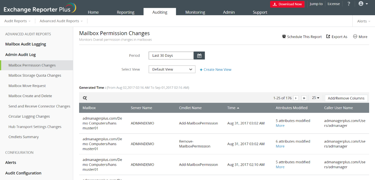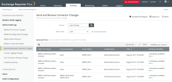 使用Exchange Reporter Plus的管理员审计日志报表审计您的管理员所做的所有更改。