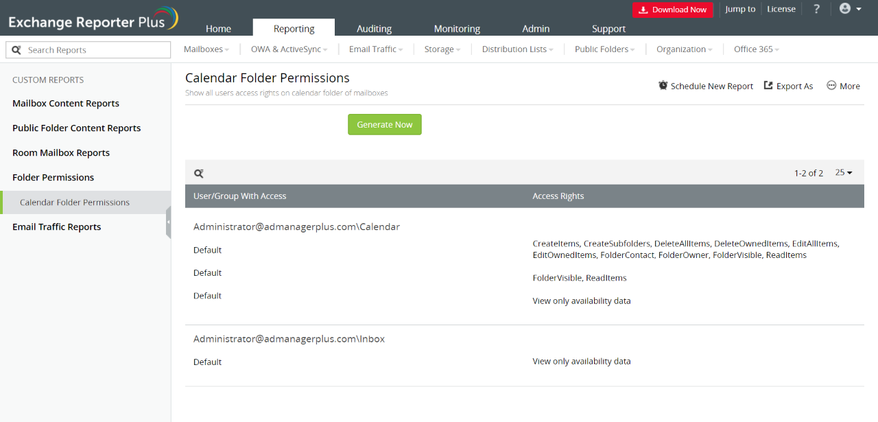 可自定义Exchange Reporter Plus的日历文件夹权限报表以满足您的需求,使您可以:
