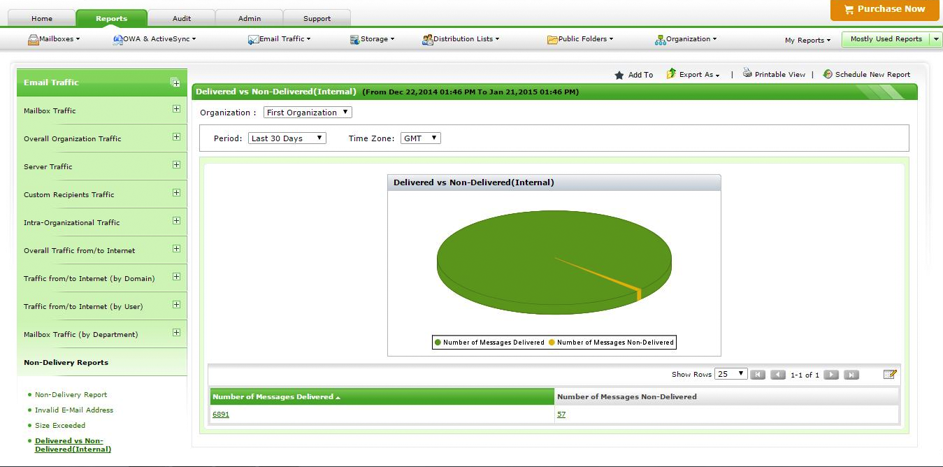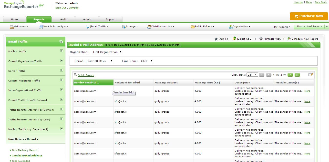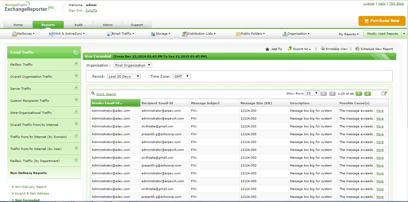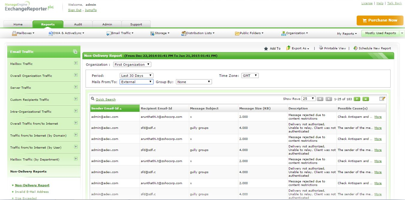 此报表提供了从已发件人邮箱发出但投递失败的电子邮件的总体视图。该界面提供发件人的电子邮件ID、收件人的电子邮件ID、主题、大小和可能的投递失败原因等详细信息。它为Exchange管理员提供了一个详细的视图,显示给定时间段内投递失败的次数。