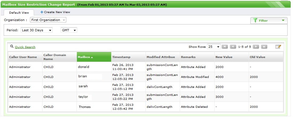 - 为邮箱设置的邮件大小限制控制了用户可以发送和接收的邮件大小。任何试图改变大小限制的尝试都将在本报表中进行报表,并提供谁修改了哪个邮箱的完整详细信息。
