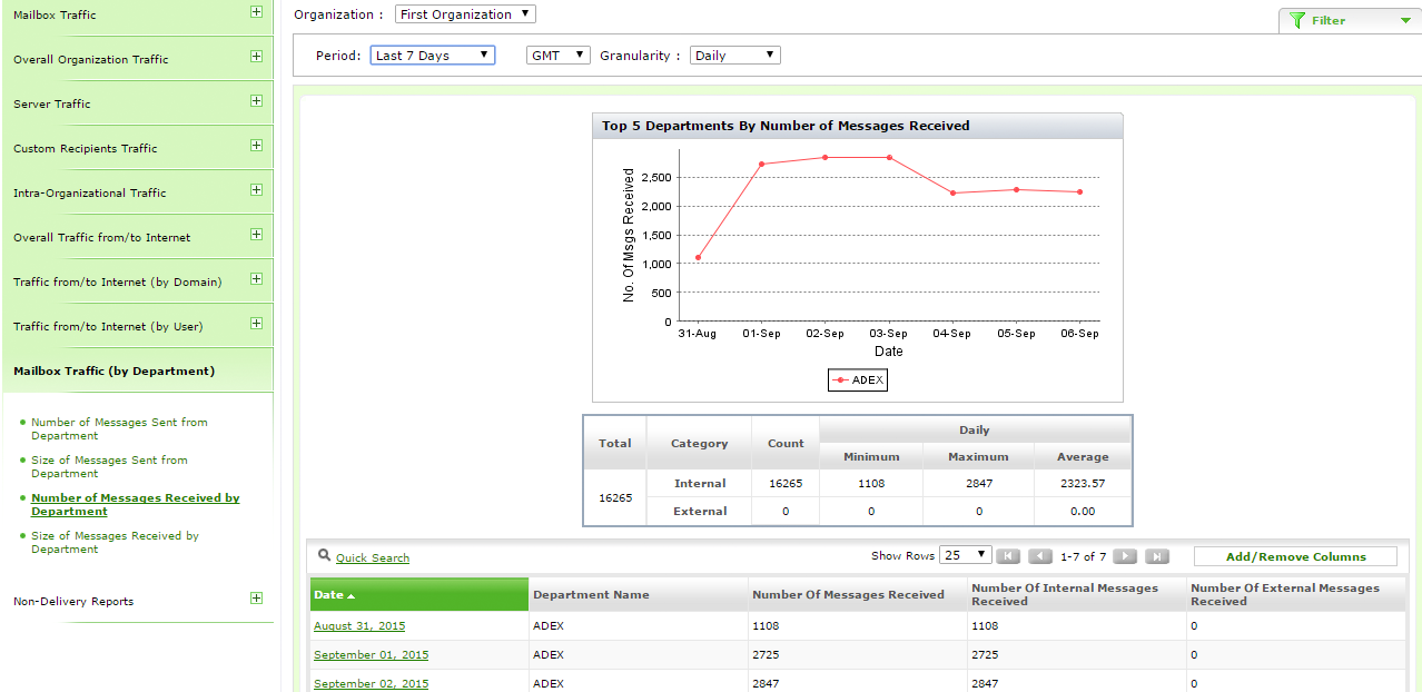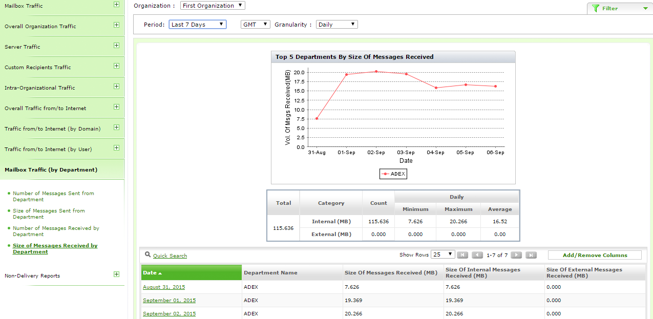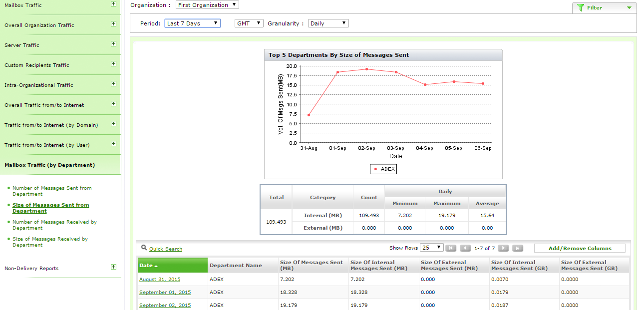 使用这些报表获取有关各部门邮件活动的详细信息。您可以根据您的需求,监控业务和非业务时间的流量。这些报表在服务器版本2003、2007、2010、2013和2016上进行配置。这些报表也可导出至目标位置,或以CSV、PDF (Adobe Acrobat)、XLS (Excel)和HTML等格式以电子邮件的形式发送给您。