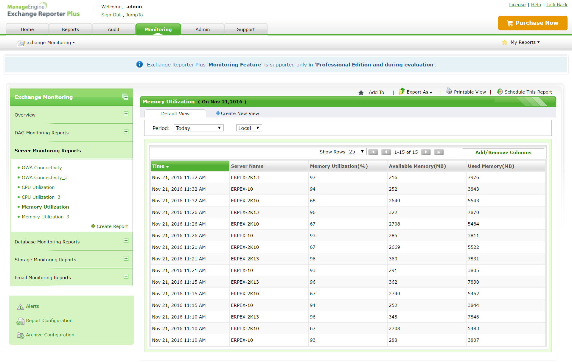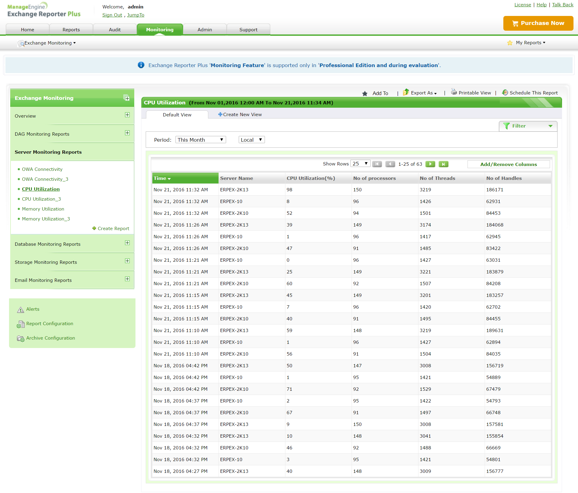 Exchange Reporter Plus监控关键Exchange组件的运行状况,并以易于理解的格式显示所需信息。此解决方案使用PowerShell命令来监控CPU和内存使用率、数据库运行状况、邮箱复制运行状况等。