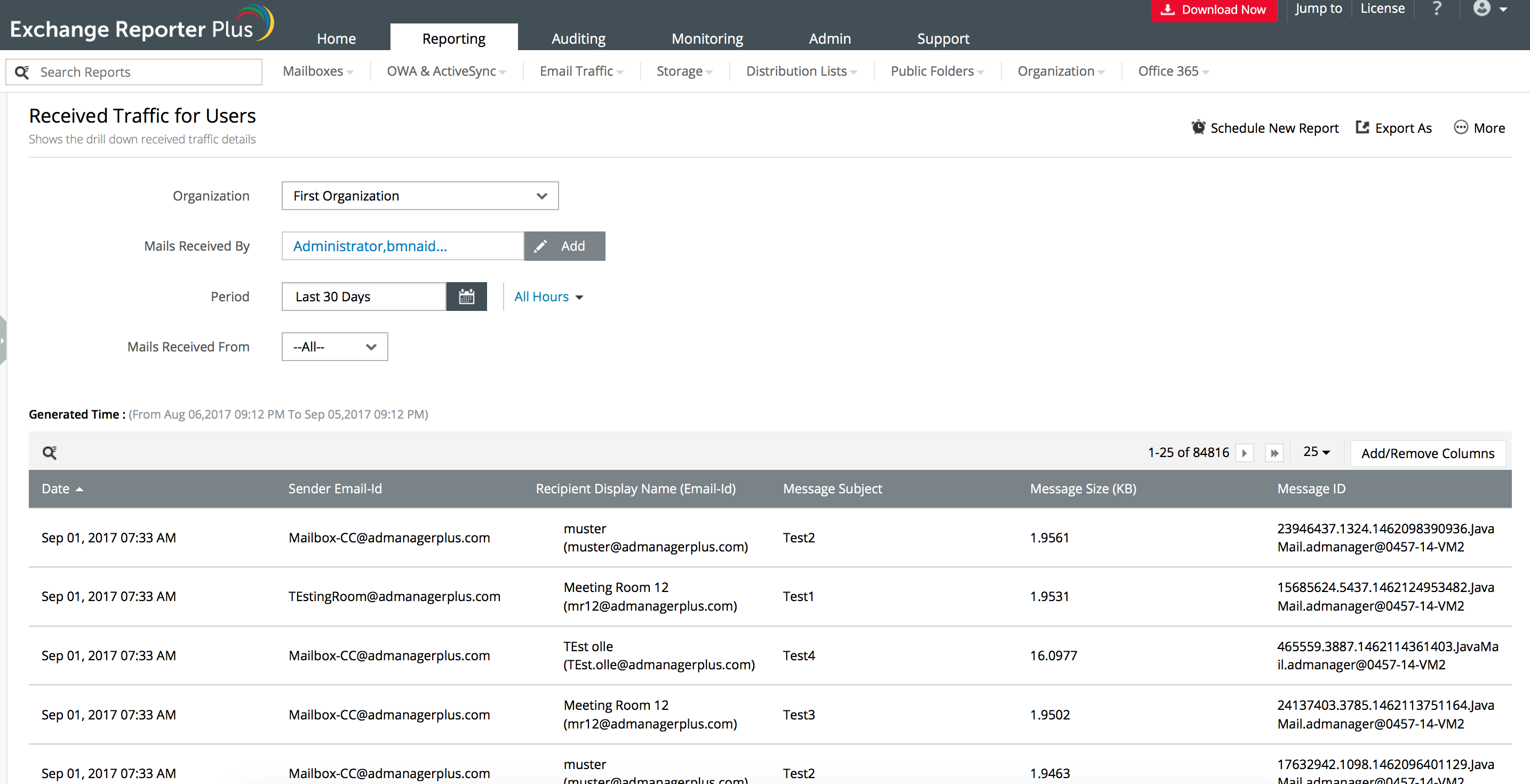 此报表列出您的Exchange组织中用户在任何特定时间段内接收的所有电子邮件。对于任何用户,请查看其电子邮件地址和接收的所有电子邮件以及详细信息,如发件人地址、电子邮件接收期、邮件大小和电子邮件主题。您还可以使用此报表查看多个用户的传入电子邮件流量。
