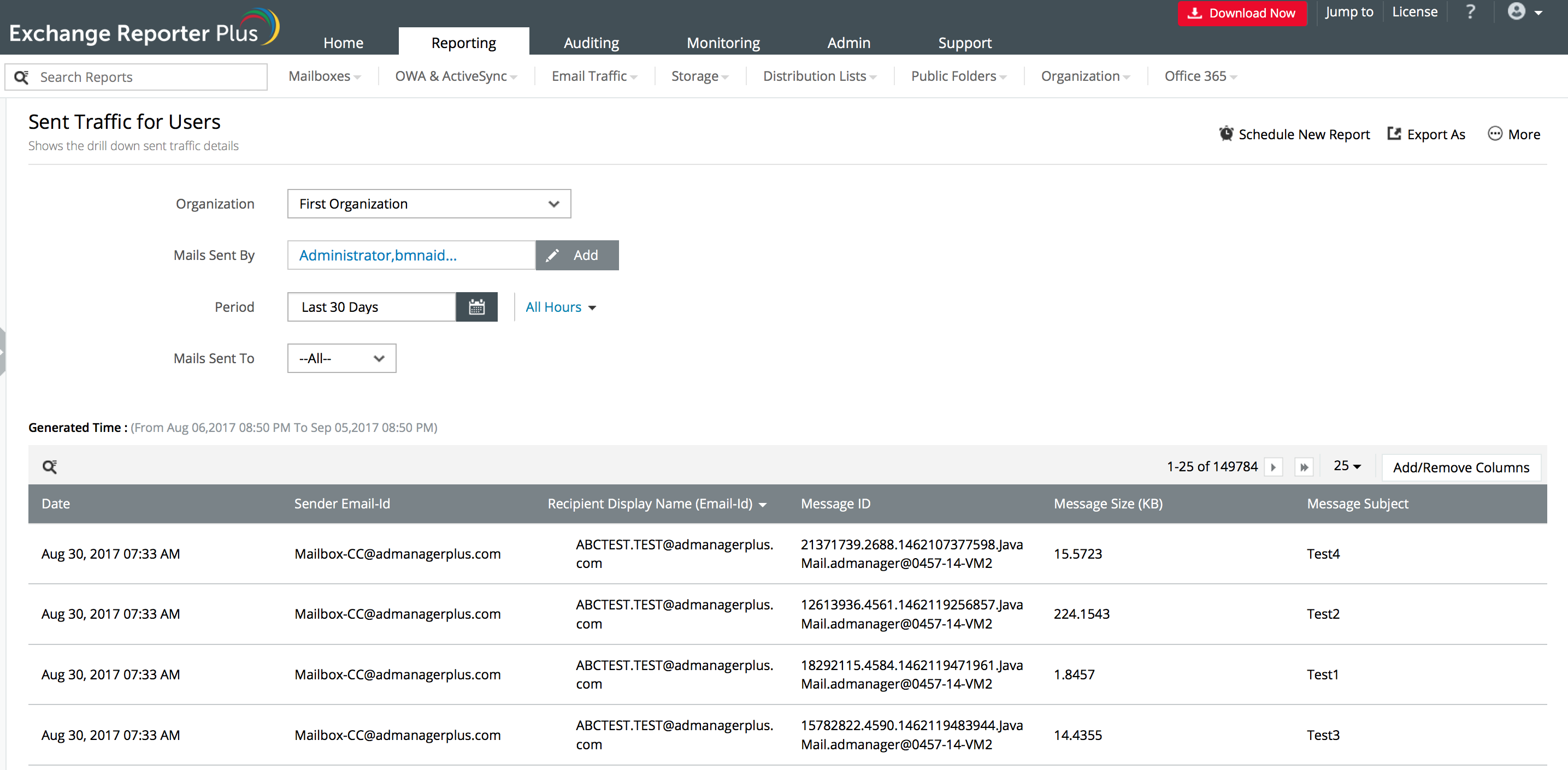 除了获取用户传入和传出电子邮件流量的深度详细信息外,Exchange Reporter Plus还提供独家报表以查看摘要数据,如用户接收或发送的电子邮件数量以及用户接收或发送的邮件总大小。