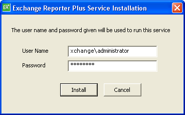 在安装 "Exchange Reporter Plus Service"的时候,将会弹出以下用户界面,请在此界面提供本产品所在机器的具有管理员权限的用户凭据。