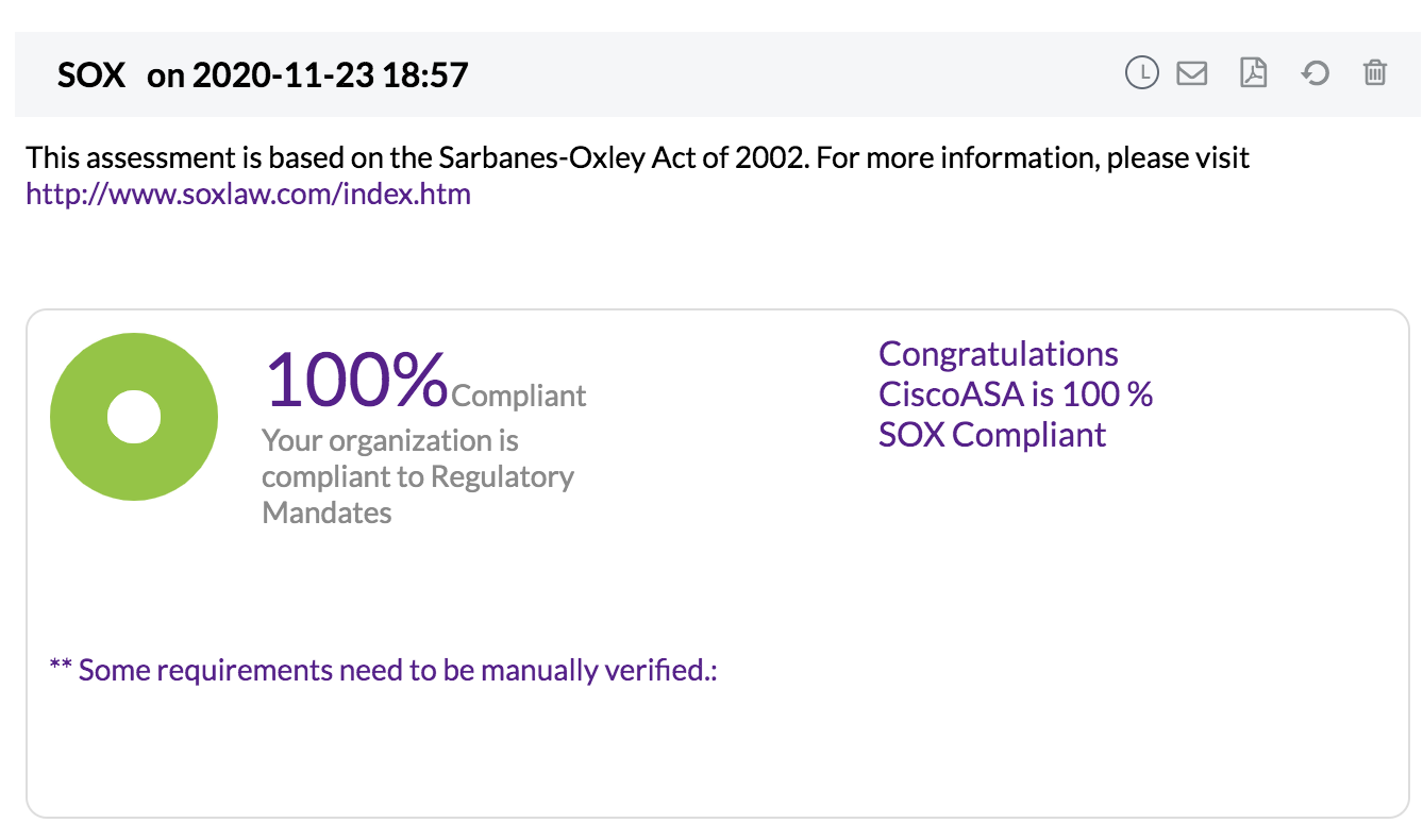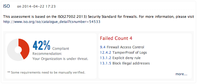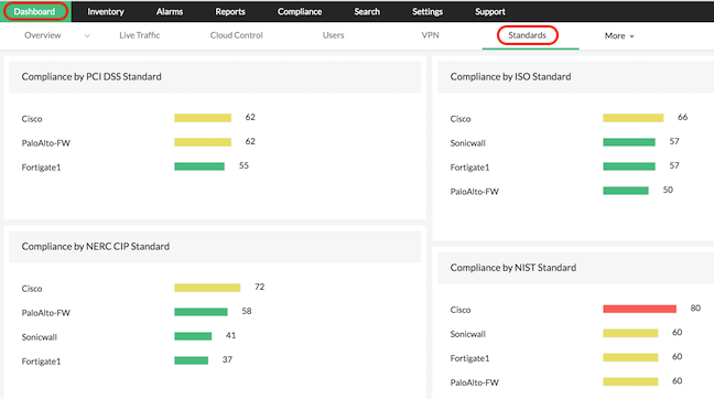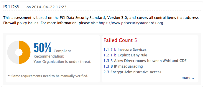 Firewall Analyzer 的集成合规性管理功能通过其开箱即用的防火墙安全标准报表自动执行您的防火墙合规性审计,报表符合以下法规要求