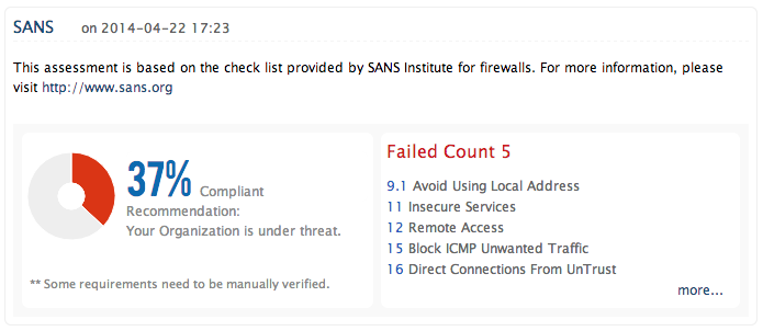 Firewall Analyzer 可帮助您将组织的防火墙配置状态与 SANS 检查表的状态进行比较,并确保全天候安全。该解决方案还可以自动执行您的定期防火墙审计,从而提高您的运营效率。
