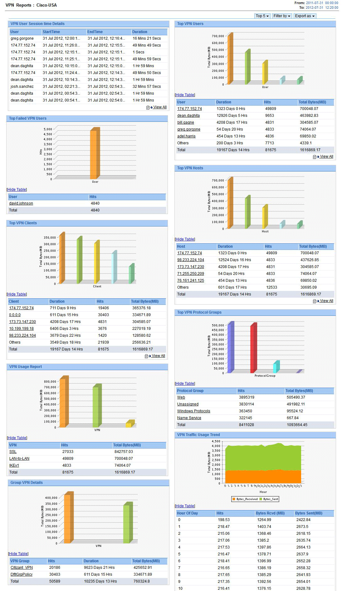为一组用户提供 VPN 使用详细信息,包括命中次数、使用持续时间和 VPN 流量总字节数的详细信息。