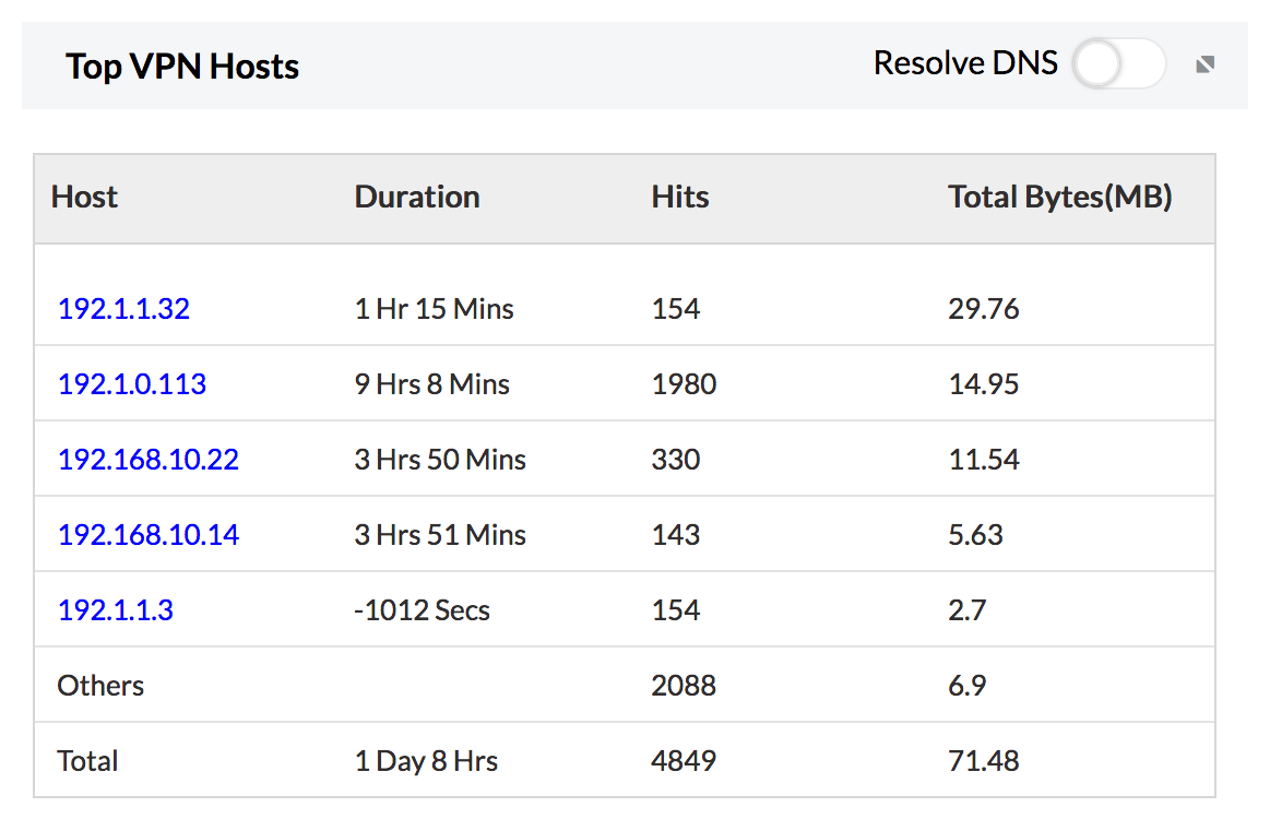 如果您的环境中配置了远程主机 VPN,顶级 VPN 用户报表将非常方便。它基本上为您提供连接到您的 VPN 的用户以及他们消耗的流量。
