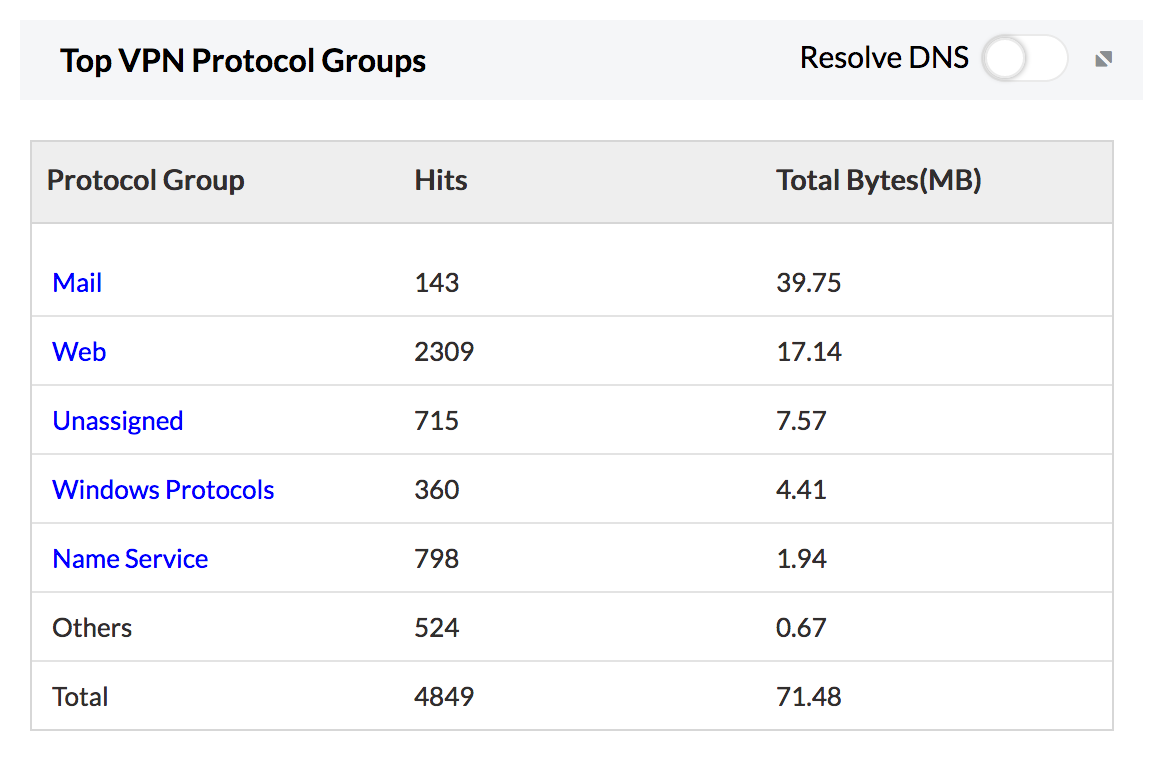 顶级协议组,为您概述 VPN 网络中使用的协议类型。这在站点到站点 VPN 的情况下非常有用。有些防火墙会在 VPN 日志中生成应用层协议信息,有些可能不会。对于在日志中生成协议信息的防火墙,此报表可以提供极好的见解。