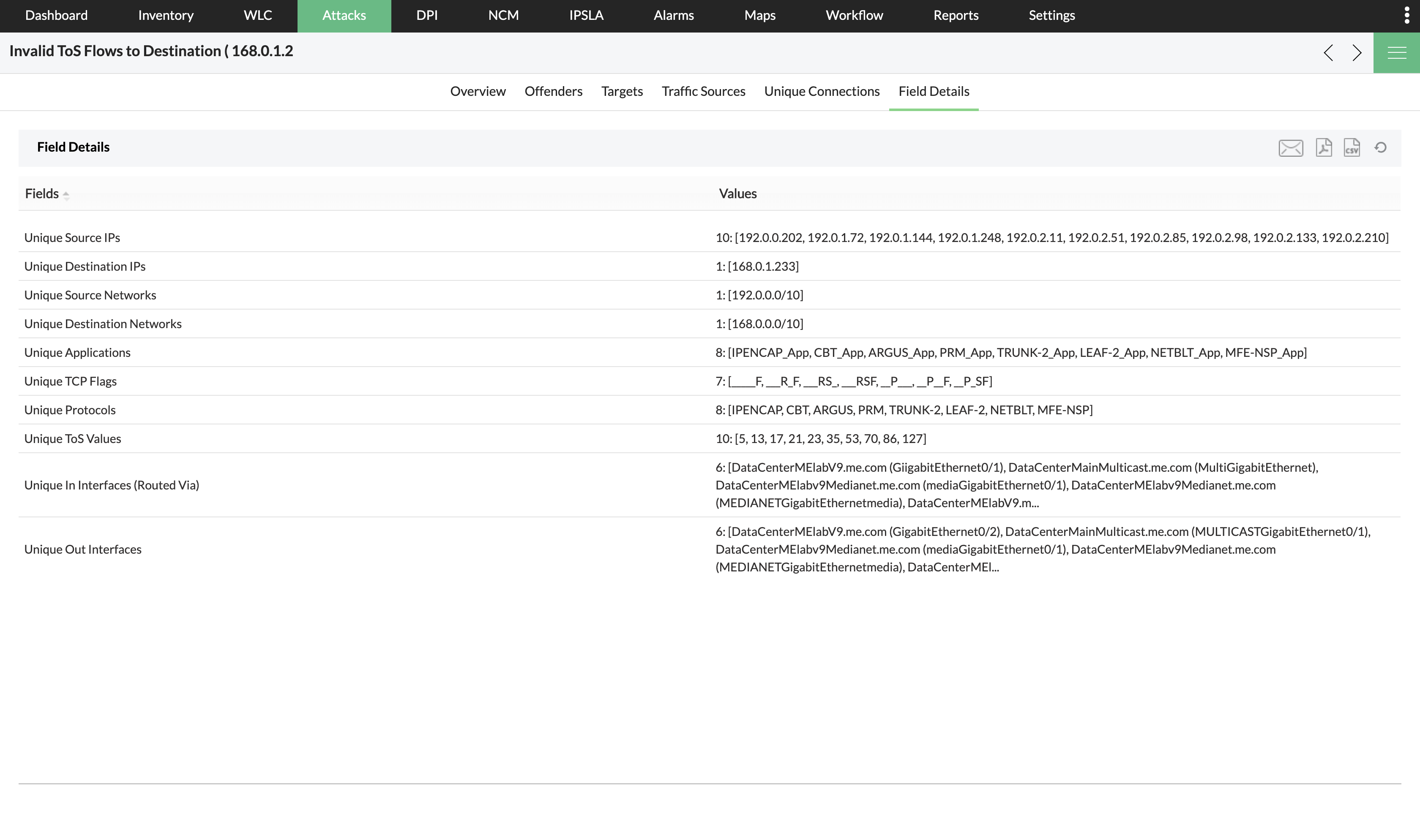 事件详情提供了有关问题的详细信息。这些信息包括:网络、端口、协议、TCP标志等。点击路由器名称,将给出映射的目标-源IP和应用程序、端口、协议等的详细信息。该报表可以导出为pdf格式,也可以通过邮件发送。