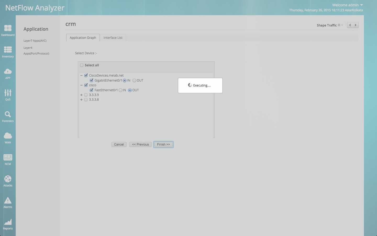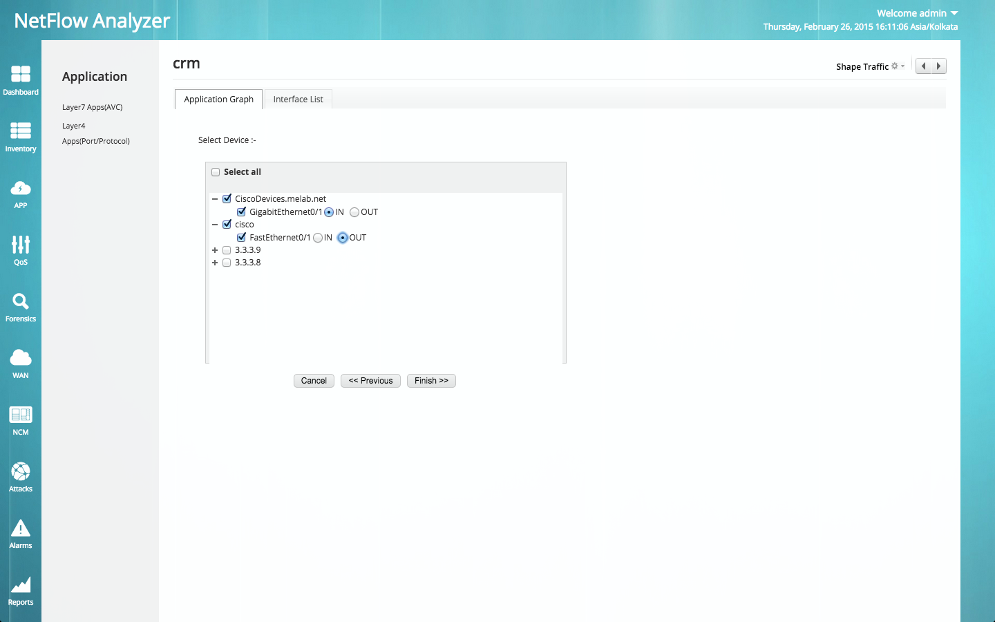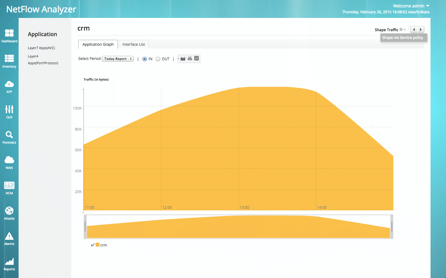 通过使用CBQoS配置为您的流量整形,从而以更好的方法调整您的流量策略。设置特定策略以控制您网络中的流量是一个持续的任务。随着新应用程序抵达且较旧的协议变得过时,网络流量模式发生更改。NetFlow Analyzer使用简单的方法为您的接口流量整形及为您的关键应用程序指定优先权。如果最关键的应用程序(CRM)的流量下降,那么您可以按如下所示将更多带宽百分比分配给CRM应用程序。