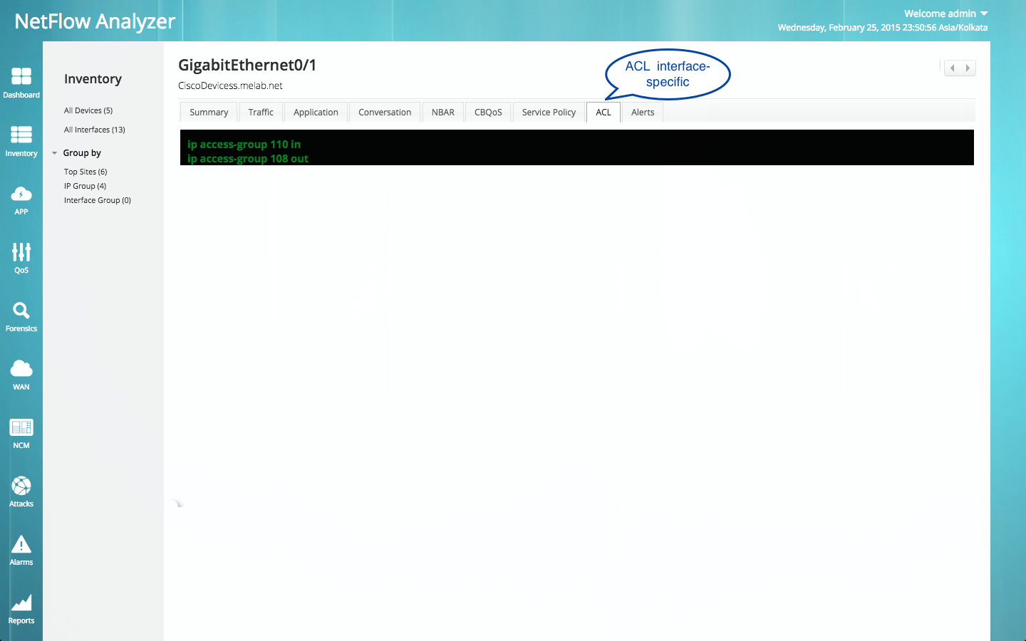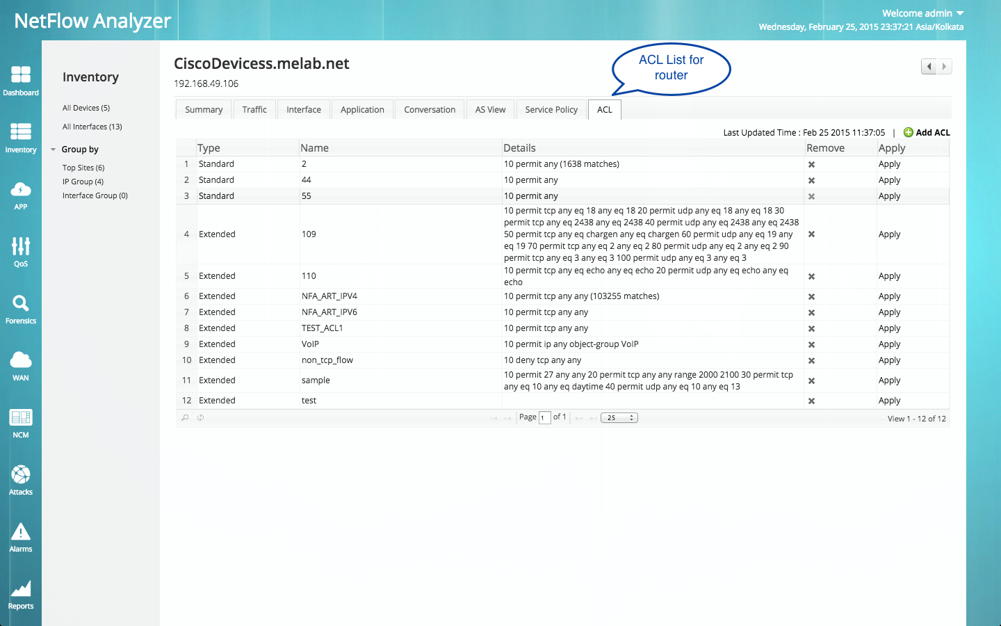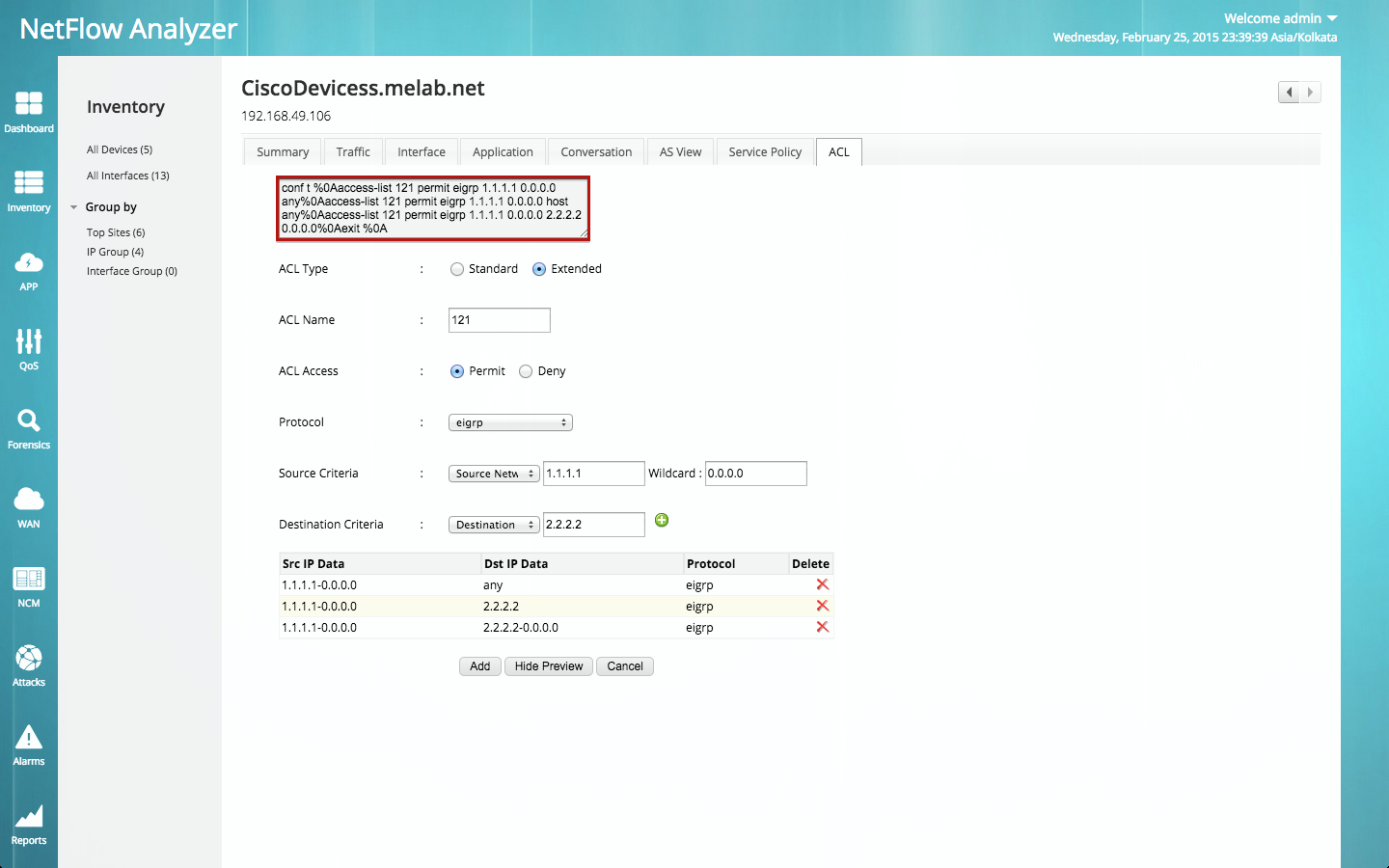 NetFlow Analyzer现在允许您重新配置应用程序流量和ACL输出You Tube流量。现您可以配置QoS和ACL,以便基于来源和目标地址、端口和协议为第4层应用程序筛选路由器流量。它允许明确许可的数据包,拒绝其他所有数据包。您可以筛选不受信任的来源地址,让它们没有机会进入并通过攻击影响您的应用程序。因而,为应用节省您的带宽并可为您的公司带来盈利。
