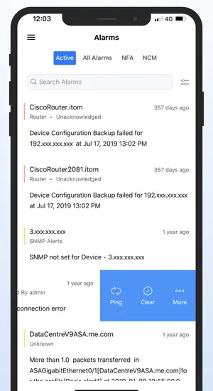 答:应用首页仪表盘可展示最近告警,告警根据严重程度(Critical、Trouble等)分类。用户可查看详细告警信息,筛选搜索,并直接执行Ping、Traceroute、确认、清除等操作,大幅缩短故障响应时间。
