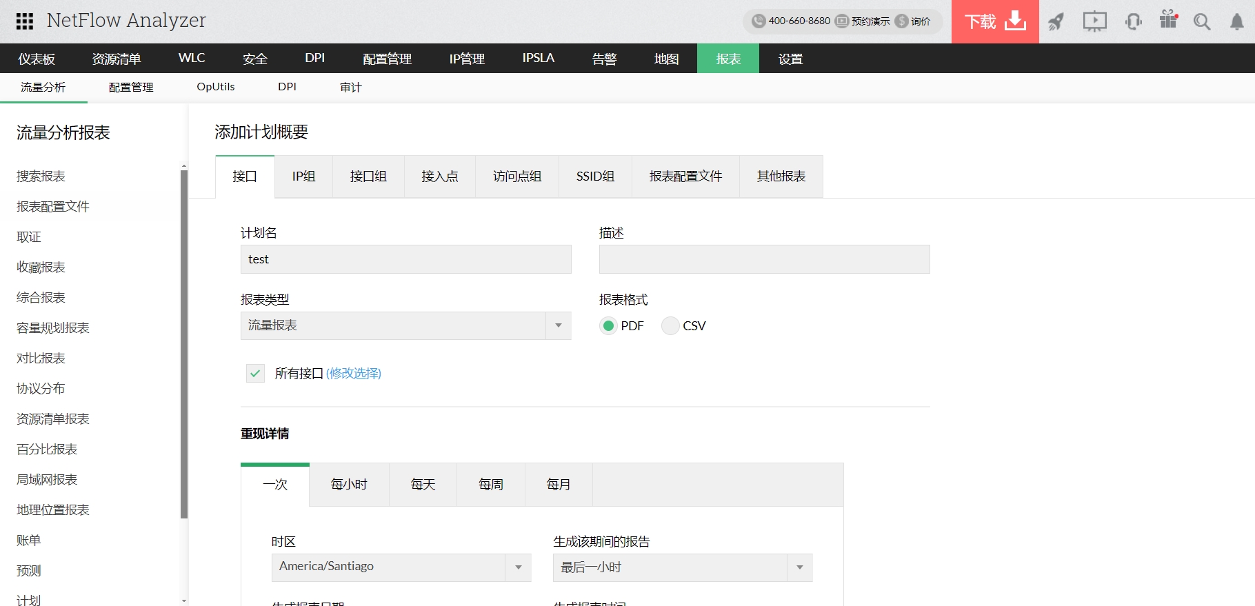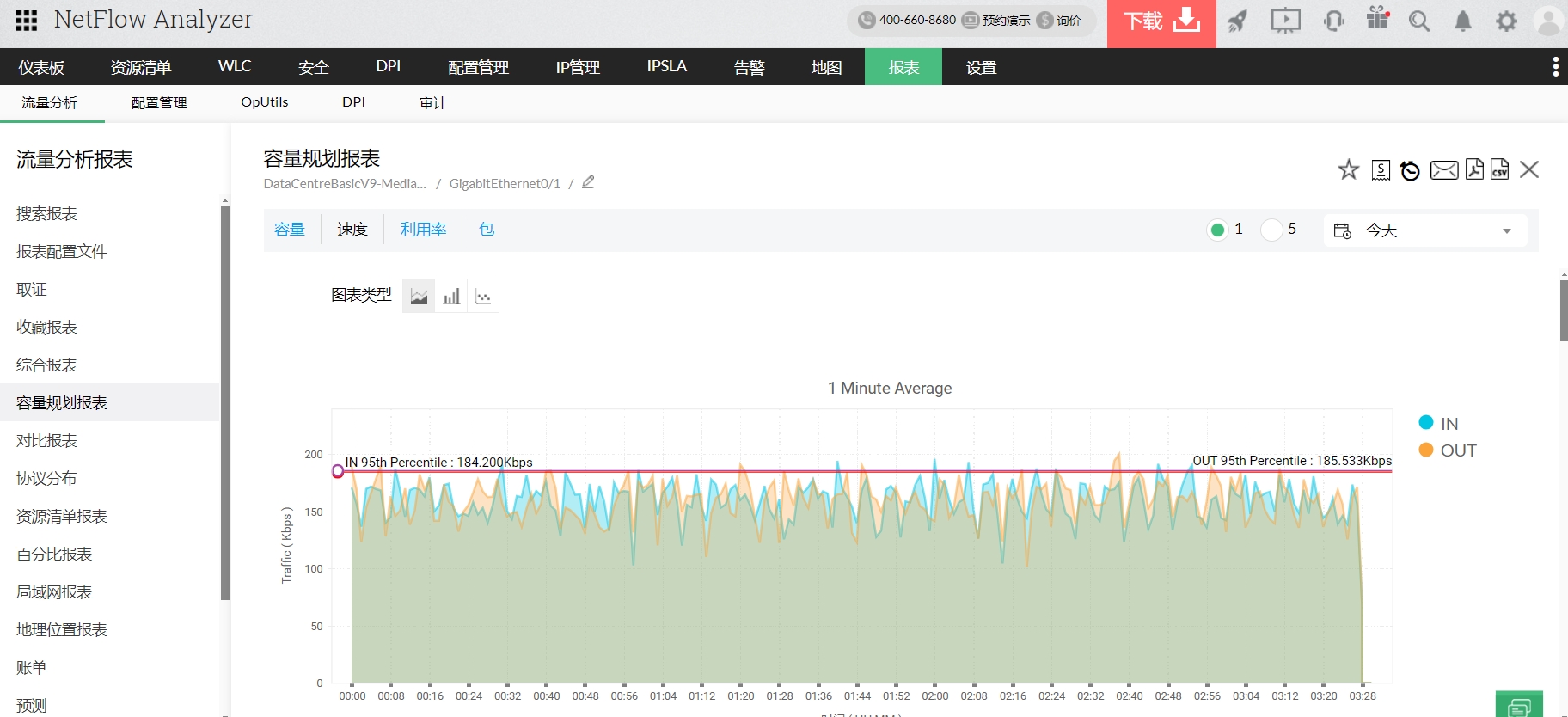 容量规划报告是根据选定的源和流量类型生成的。借助准确的统计数据,网络管理员可以了解更多关于链接使用时间的信息,以及使用的顶级应用程序。使用应用程序的细分来度量带宽使用情况,列出了报告中引用的前10个应用程序的IN和OUT细节,包括应用程序类型、流量量和流量百分比。通过启用业务小时过滤器,并在报告中排除周末,可以获得关于设备的建设性见解。生成的报告可以以PDF和CSV格式导出,也可以通过电子邮件发送给多个用户。