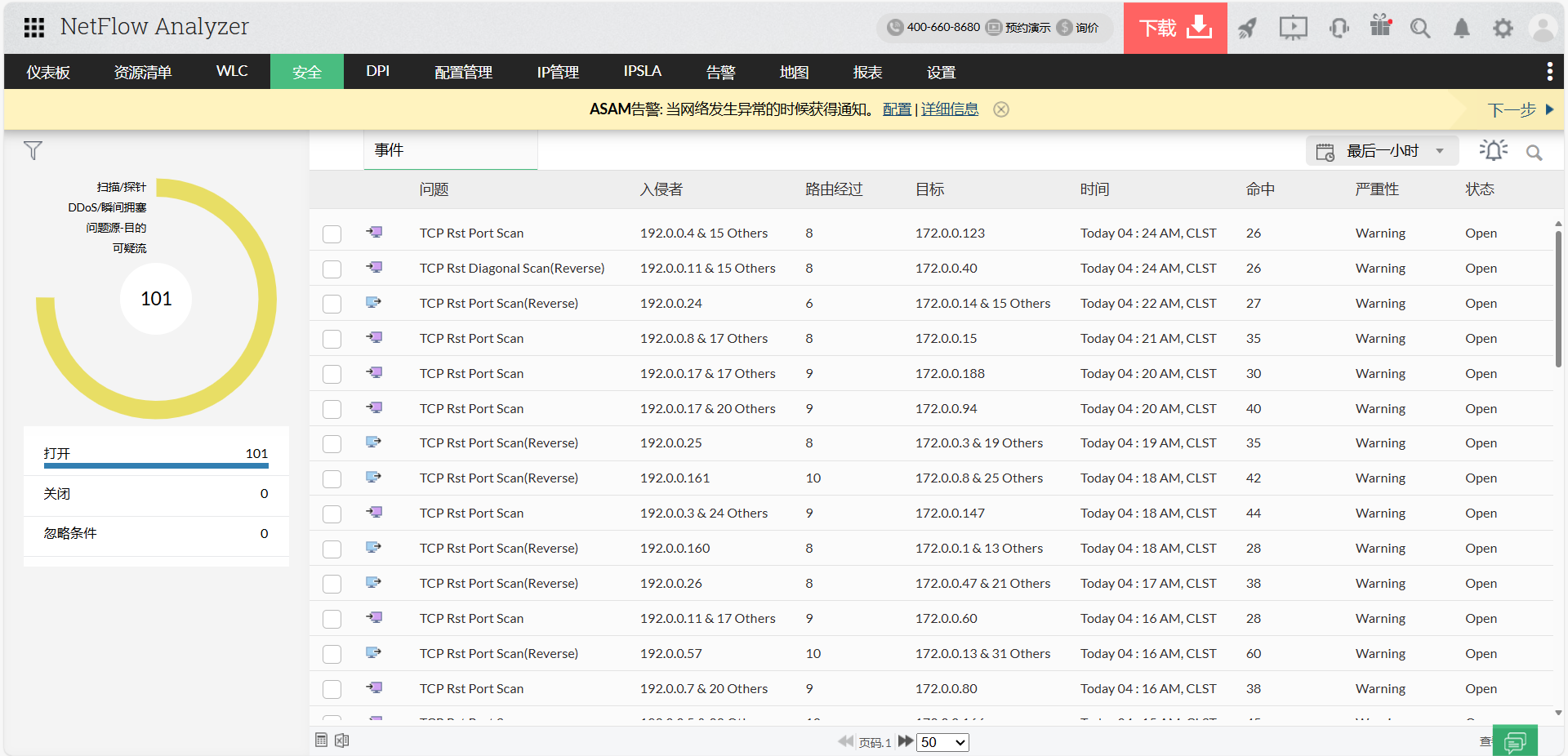 ASAM对网络中发生的安全事件进行了深入的研究。它有助于检测零日网络入侵。本文将安全威胁分为四个不同的类别:1。坏的Src-Dst 3。多斯攻击3 疑犯流4号。扫描/探测。这些类别基于格式不正确的TCP/UDP数据包、无效的TOS流和无效的源/目标。
