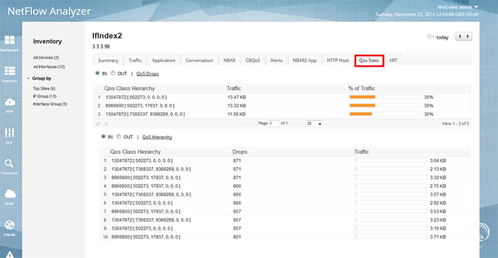 使用以应用程序为中心的QoS监控来控制应用程序带宽使用,设置不同的优先级并基于应用程序和业务需求动态选择网络路径。QoS统计信息选项卡列出QoS特定的信息,主要有2个报告,即QoS类层次结构和QoS下降报告。QoS类层次结构报告让用户可以看到应用程序的层次结构类以及特定应用程序的分布。QoS下降报告列出不同流量类型的策略前、策略后和下降流量以及排队状态,使您能够验证QoS设置的效力。
