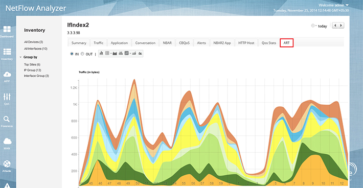 ART指的是应用程序响应时间,ART报表帮助基于其响应时间来识别网络中最具潜力的应用程序。该报表显示客户端数据包、服务器数据包、事务、重传、新连接、响应和流量。此外,深入探索每个应用程序可显示图表,通过绘制响应与时间来描述客户端体验。QoS和ART将仅在已启用AVC设备的设备和接口栏下面动态显示。