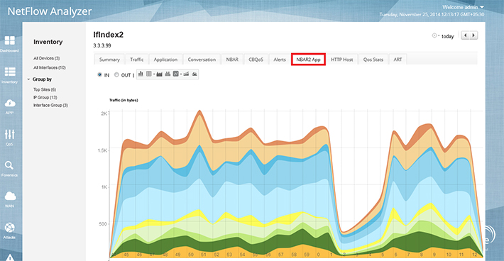 NetFlow Analyzer现在支持Cisco NBAR2,以便实时分析和分类应用程序流量。通过NBAR(基于网络的应用程序识别)可深入了解第7层应用程序流量,它默认包含超过1,000个应用程序。NBAR2报表显示使用NBAR2识别的应用程序列表及其流量详细信息,以及特定应用程序的流量在网络总流量中的占比。这有助于确保有效地利用网络带宽。通过了解这一点,可以设置好QoS标准。
