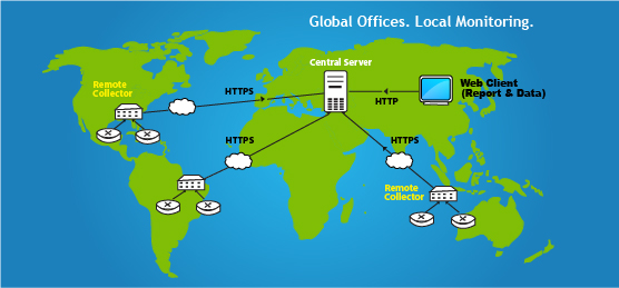 典型设置涉及单个中央服务器和基于远程位置数量的“n”个分布式收集器。收集器收集并处理来自路由器的流,并通过安全的https连接将压缩数据传递到中央服务器。中央服务器存储来自收集器的数据,并提供用于生成报表的集中式Web控制台。