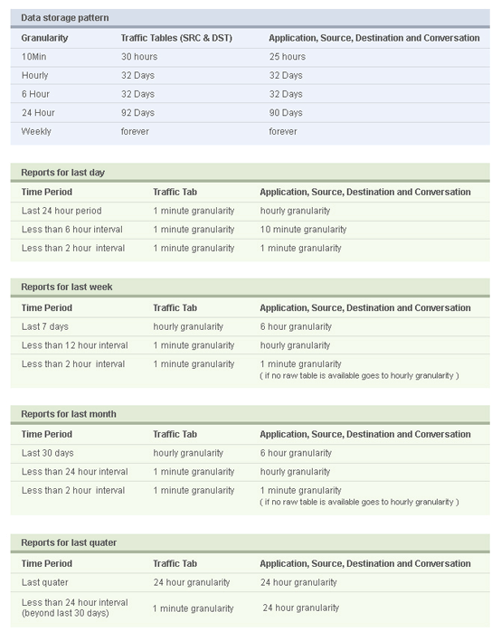 For each report, NetFlow Analyzer stores traffic information in a different manner. The following tables describe the data storage pattern for the various reports generated by NetFlow Analyzer.