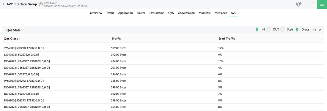 QoS统计选项卡列出了特定的QoS的信息,主要有两个报告,QoS类层级QoS丢包率报表。QoS类层级报表允许用户查看应用程序的层次结构类和特定应用程序的应用程序分布。QoS丢包率列出了策略前、策略后和不同流量类中的丢包率以及队列状态,使您能够验证QoS设置的有效性。