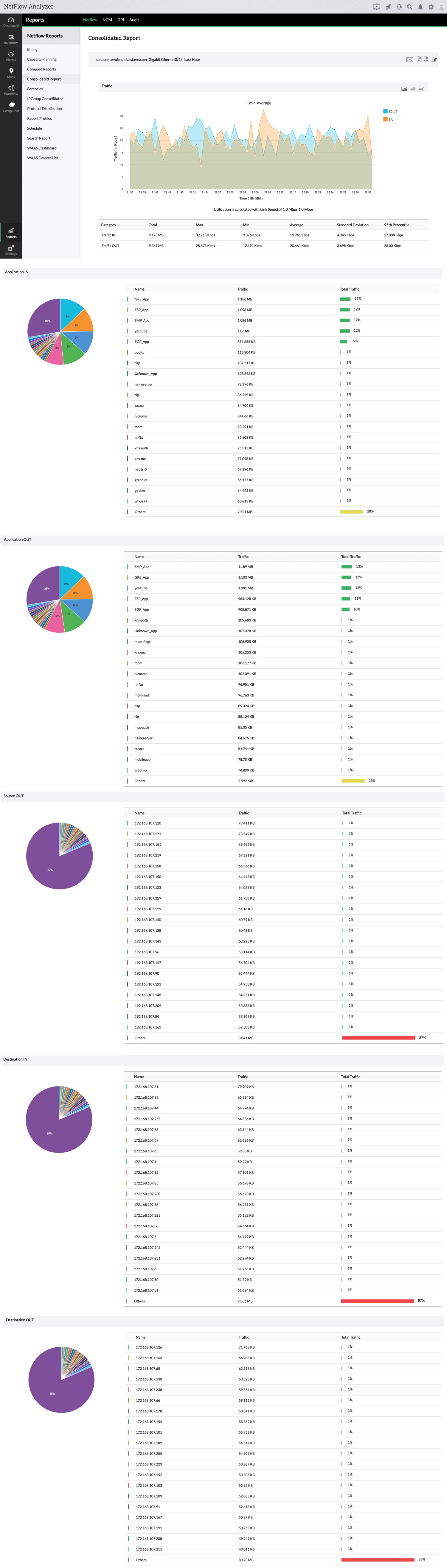 点击“生成报表”生成报表。报表以图表和表格的形式展示流量图、应用程序流入/流出、源流入/流出和目的流入/流出。