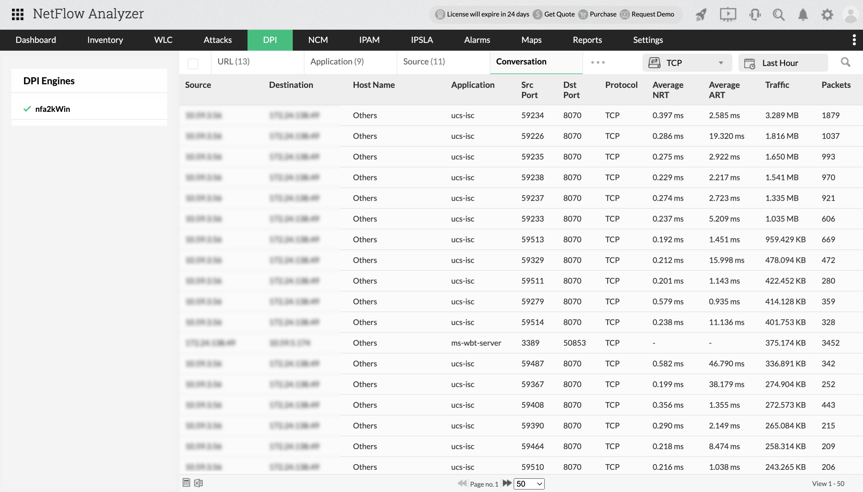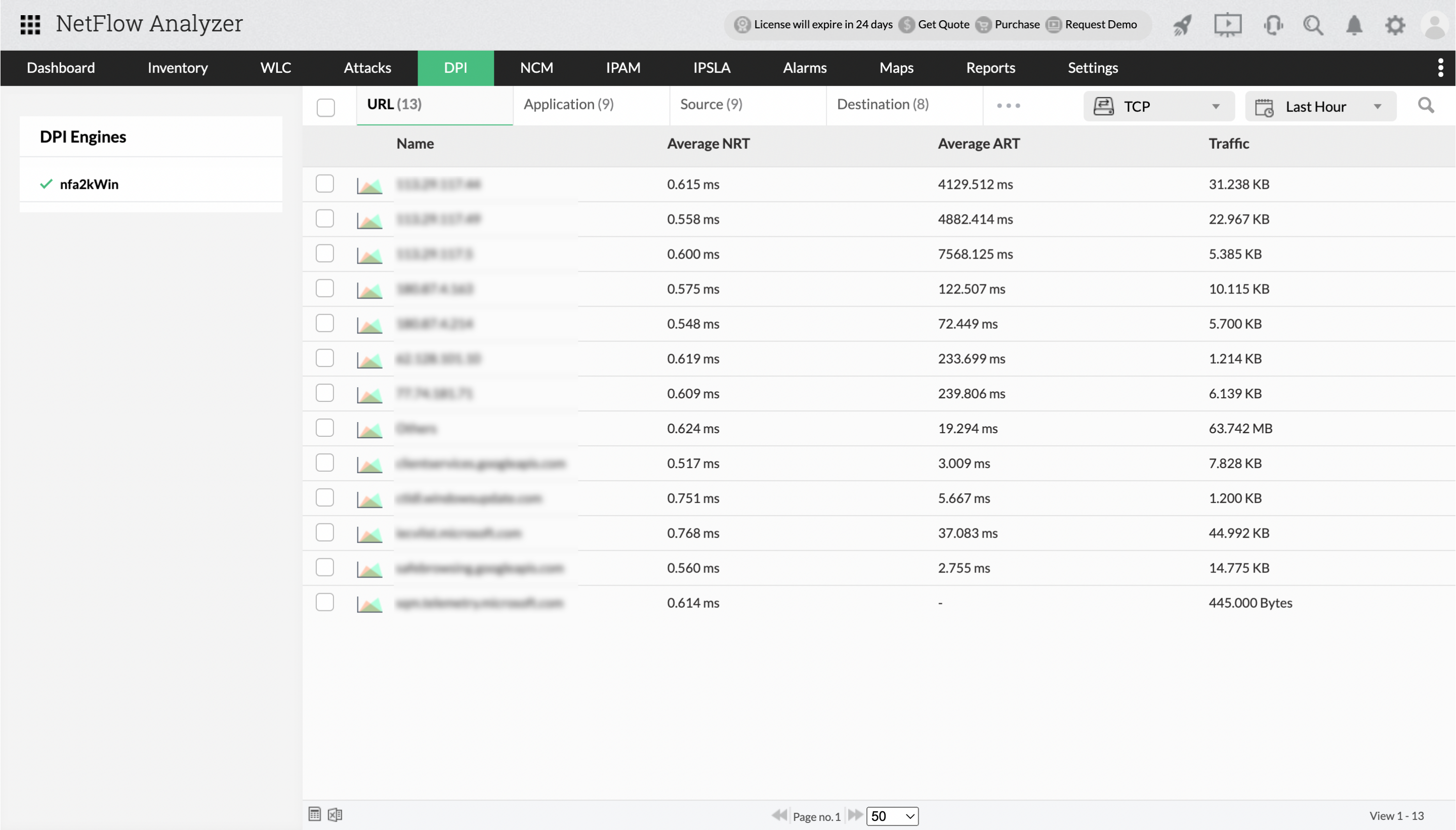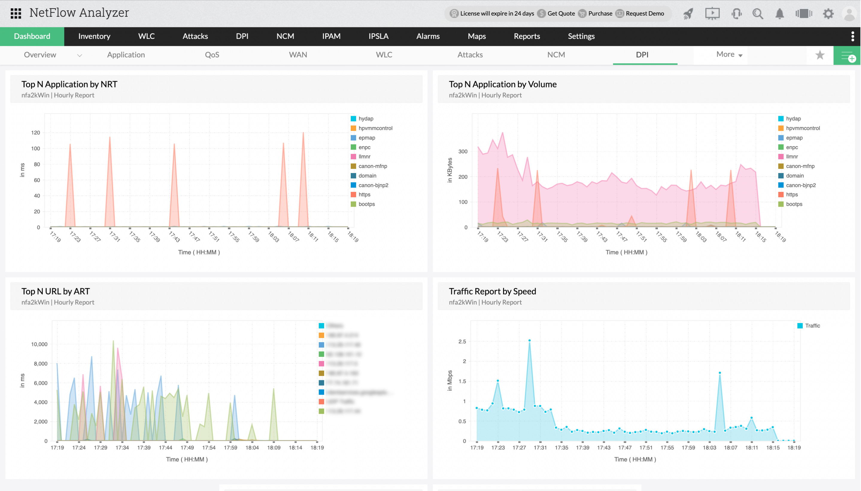 NetFlow Analyzer中的DPI仪表板提供了网络中发生的所有排名靠前的活动的详细信息。通过概述仪表板,它显示由 NRT 和 ART 计算的前 N 个应用程序、前 N 个 URL 和前 N 个对话,以及速度和音量。此外,DPI 仪表板还提供了用于编辑和选择 DPI 引擎以获得不同视图的选项。