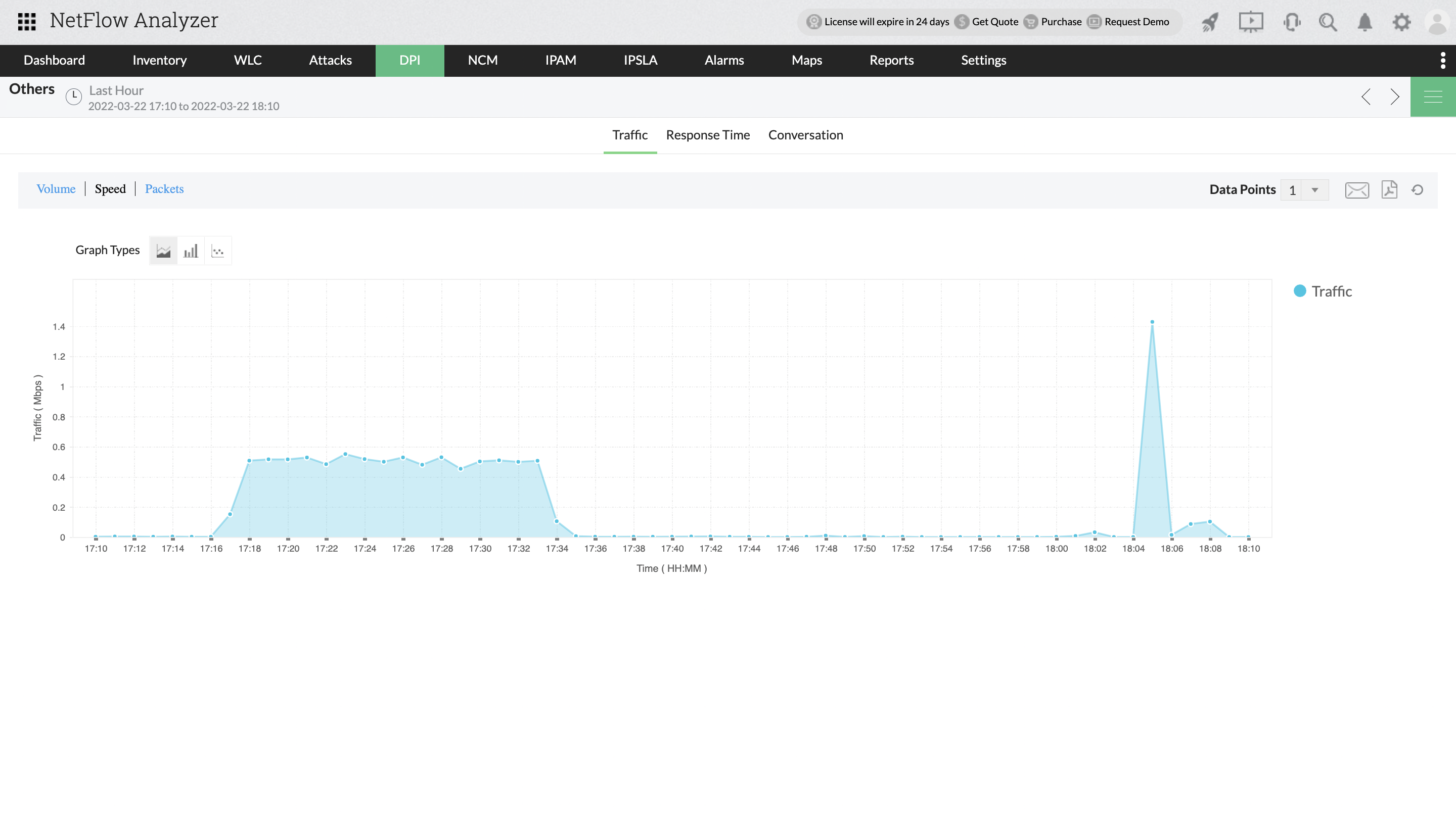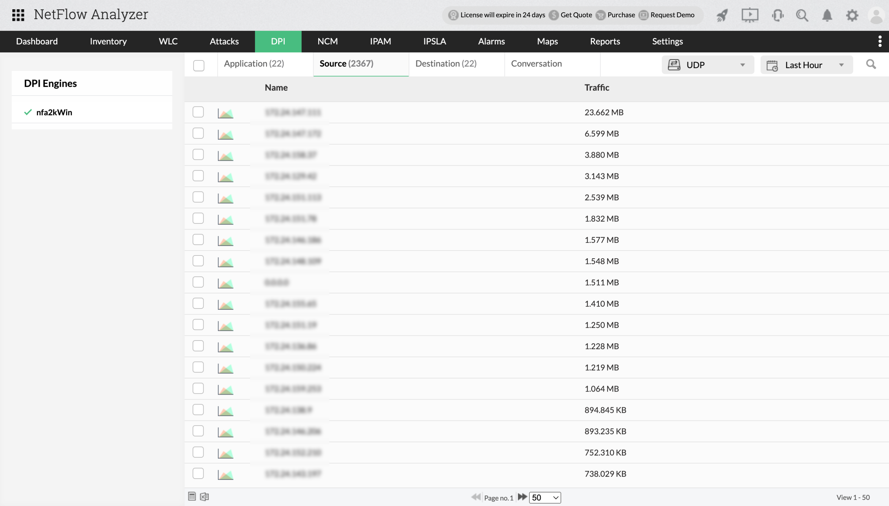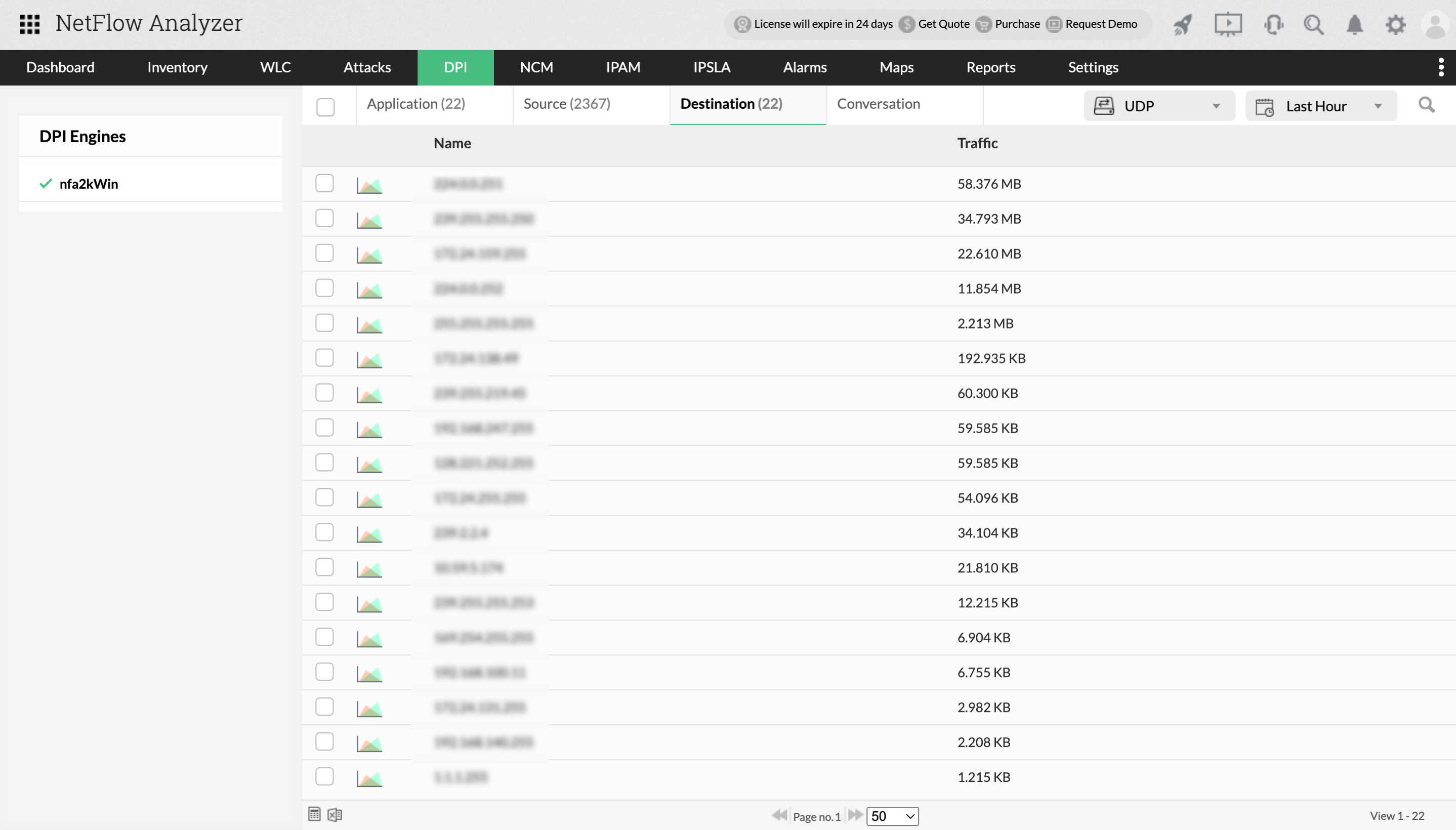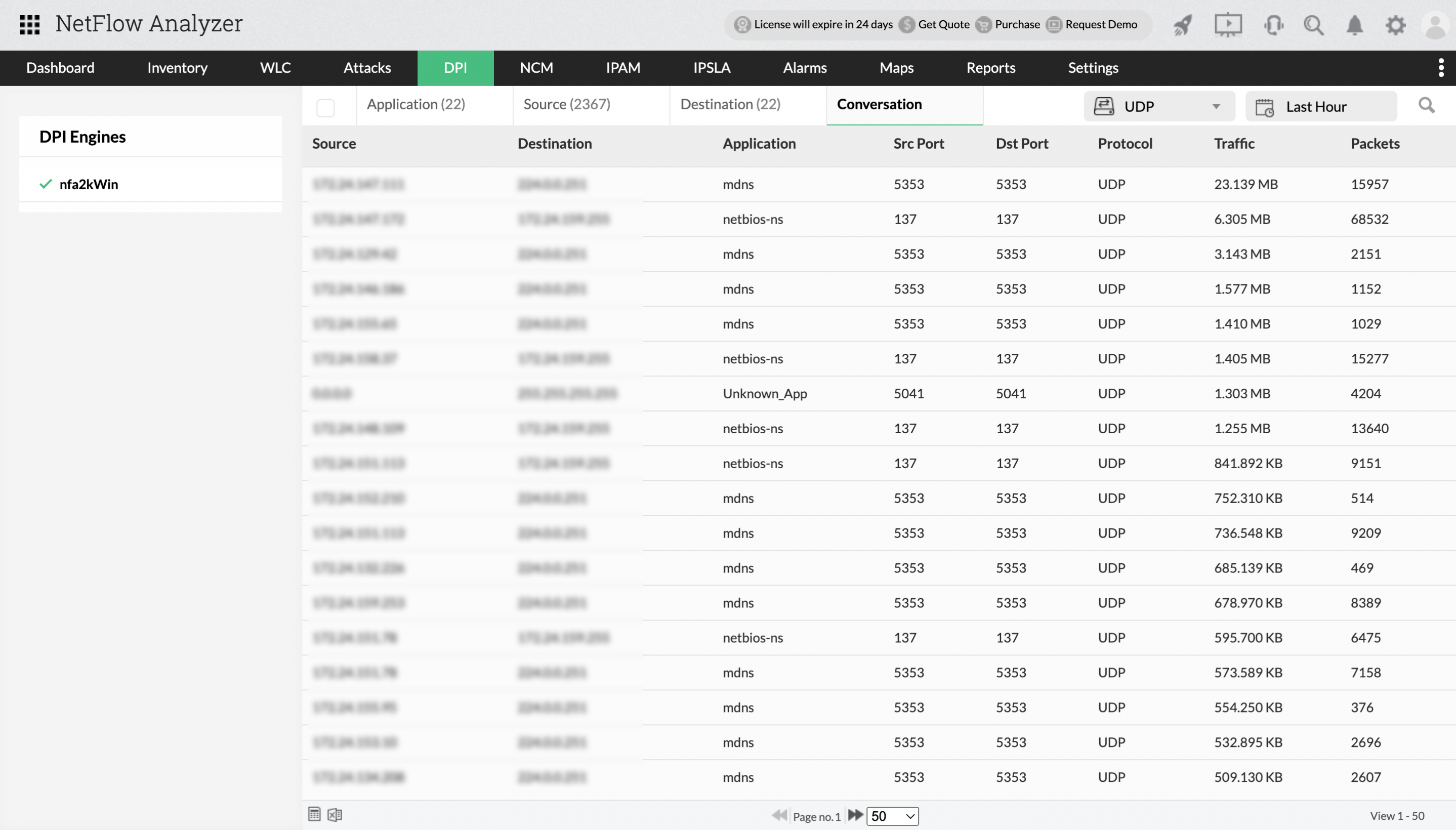 NetFlow Analyzer中的DPI仪表板提供了网络中发生的所有排名靠前的活动的详细信息。通过概述仪表板,它显示由 NRT 和 ART 计算的前 N 个应用程序、前 N 个 URL 和前 N 个对话,以及速度和音量。此外,DPI 仪表板还提供了用于编辑和选择 DPI 引擎以获得不同视图的选项。