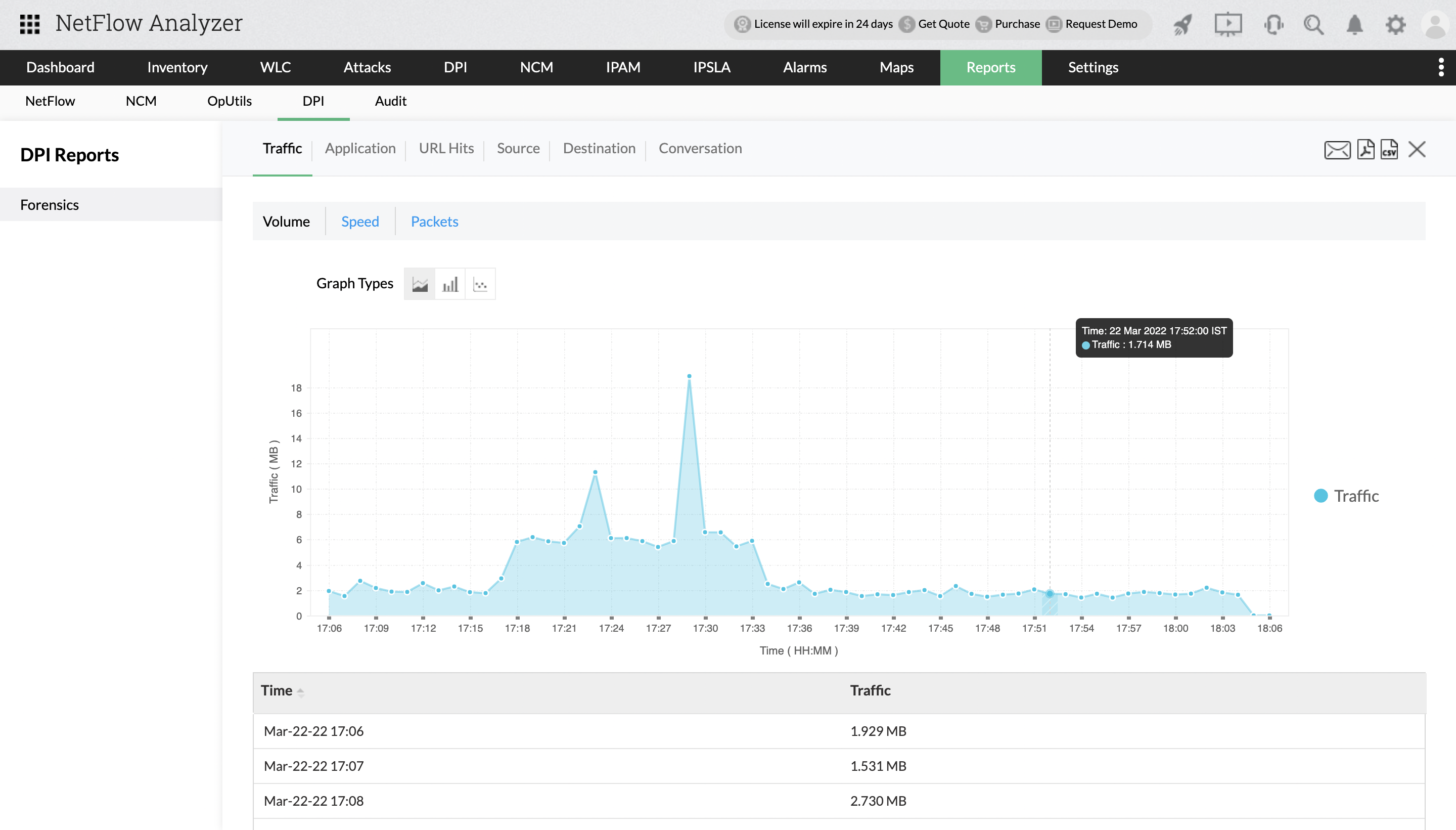 通过取证链接,您可以设置条件并查看有关通过 DPI 引擎的流量的特定详细信息。 其配置在报表 > DPI。若要生成报表,请选择配置的DPI引擎以生成报表,并选择协议 不管是TCP, UDP, 或者全部.
