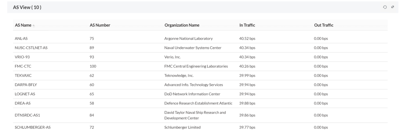 自治系统视图显示路由器所属的所有自治系统(AS)的信息,以及每个AS的流量详细信息。