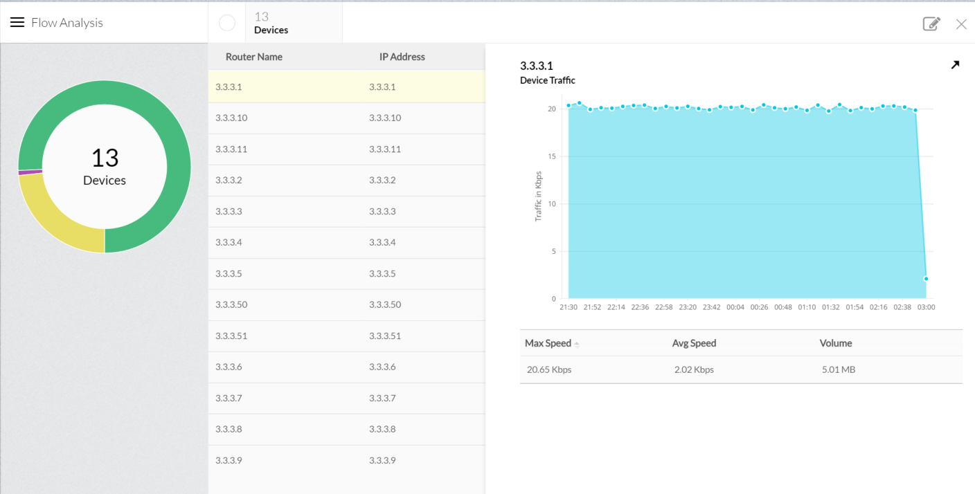 此视图列出了向NetFlow Analyzer导出流的所有设备。NetFlow Analyzer会自动检测到被配置将流数据包导出到UDP 9996(默认)端口的所有设备。