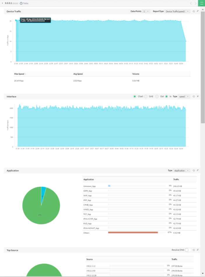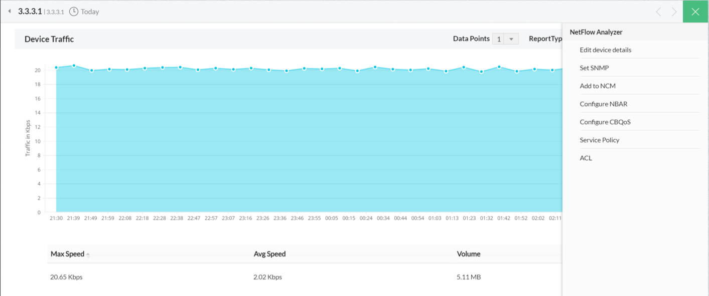 通过单击数据点选项,可以查看1、5和15分钟的平均值查看设备流量,可以改变 报表类型 去查看基于默认设备流量的图表,接口的流入速率和接口的流出速率。