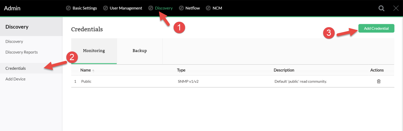 允许使用SNMP凭证对单个设备或批量设备进行SNMP更新,配置如下设置-> 发现 -> 凭证.