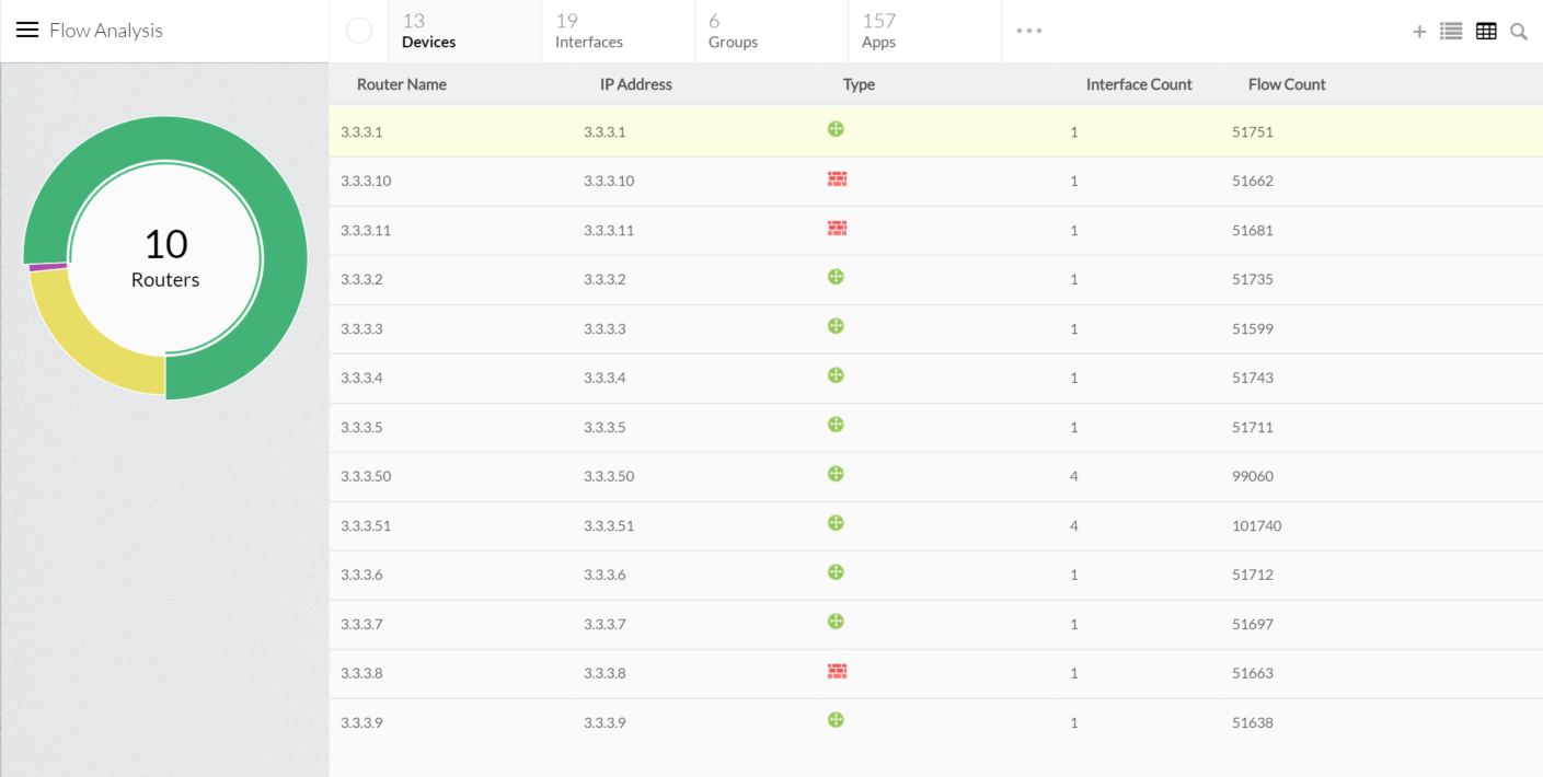 您可以点击排序按钮根据字段名进行排序,如路由器名称、IP地址、接口计数和流计数。