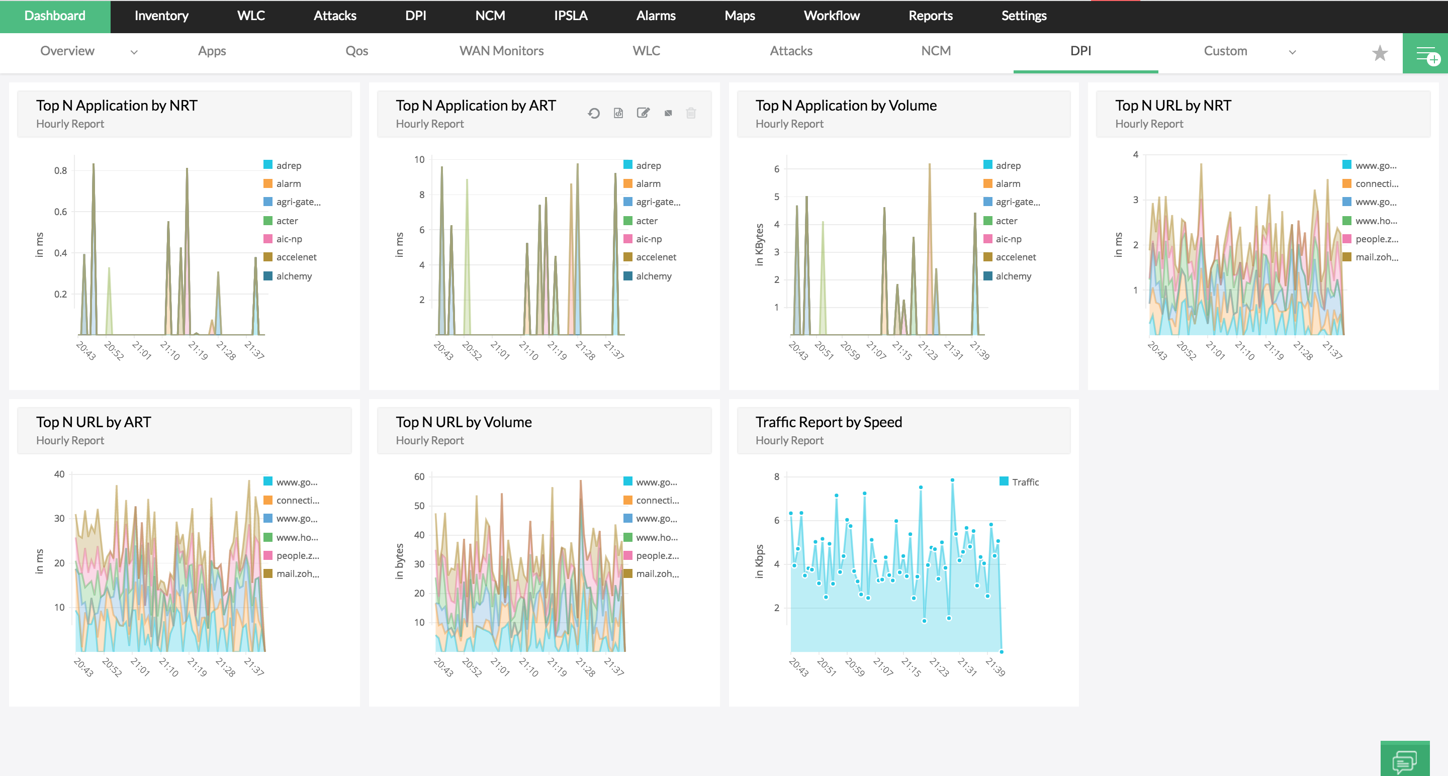 从仪表板上可以获取一目了然的详细信息,其中包括按NRT和ART排序的前N应用程序,按ART和NRT排序的前NURL,按容量排序的前N应用程序和按速度排序的前N的流量图表。