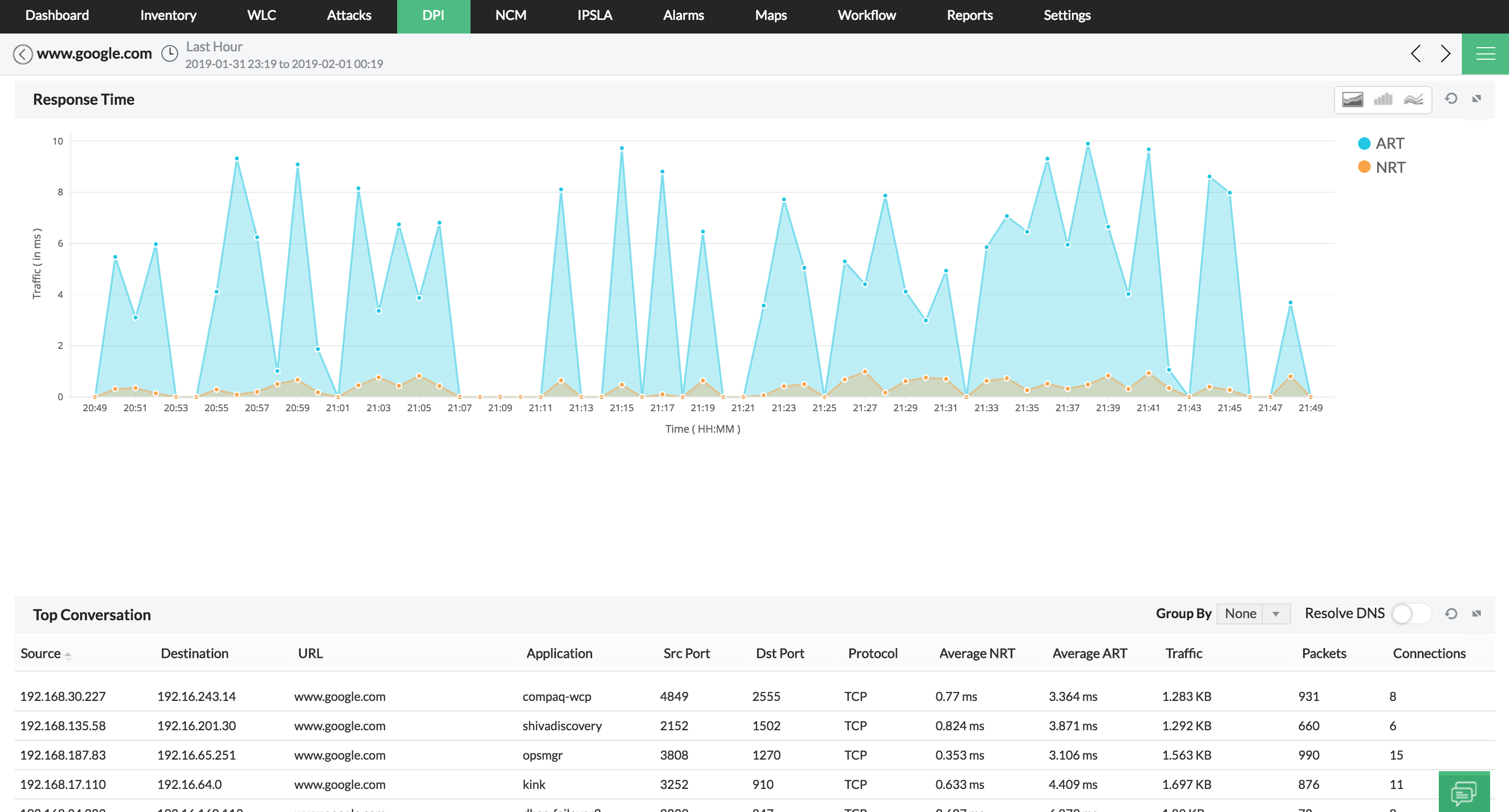下钻到某个特定应用程序或URL,并在单个视图中查看实时流量图和响应时间图,以查明确切的故障并提高网络或应用程序的可用性。对话报表有助于识别正在处于高ART和NRT的排名靠前的源和目标IP。