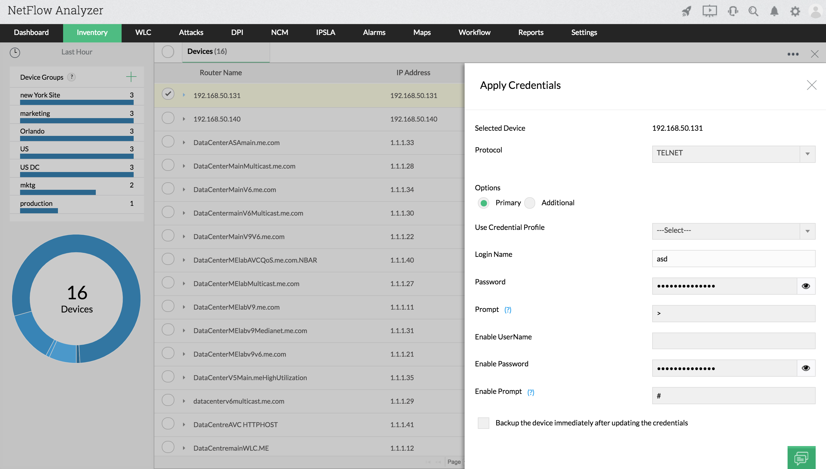 提供设备凭据,如登录名、密码、提示符、启用用户名、启用密码、启用提示符。