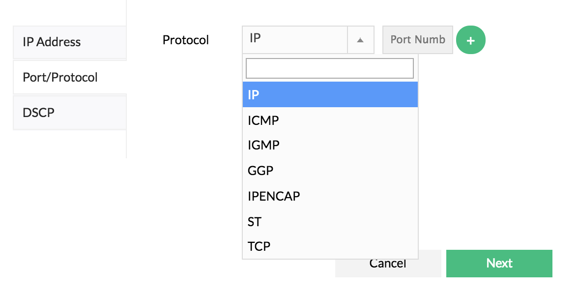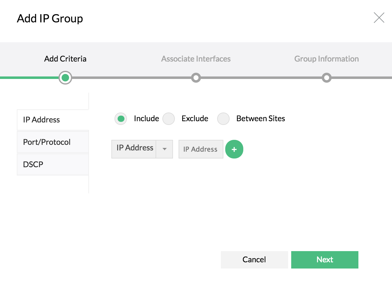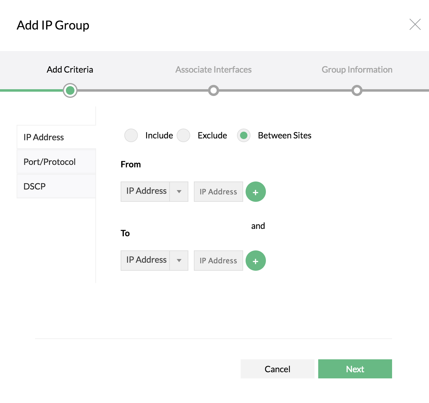 - 添加条件,请将IP类型选择为IP地址/IP网络/IP范围,并选择"包含"或"不包含"或"站点之间",然后点击"+"按钮并点击“下一步”。