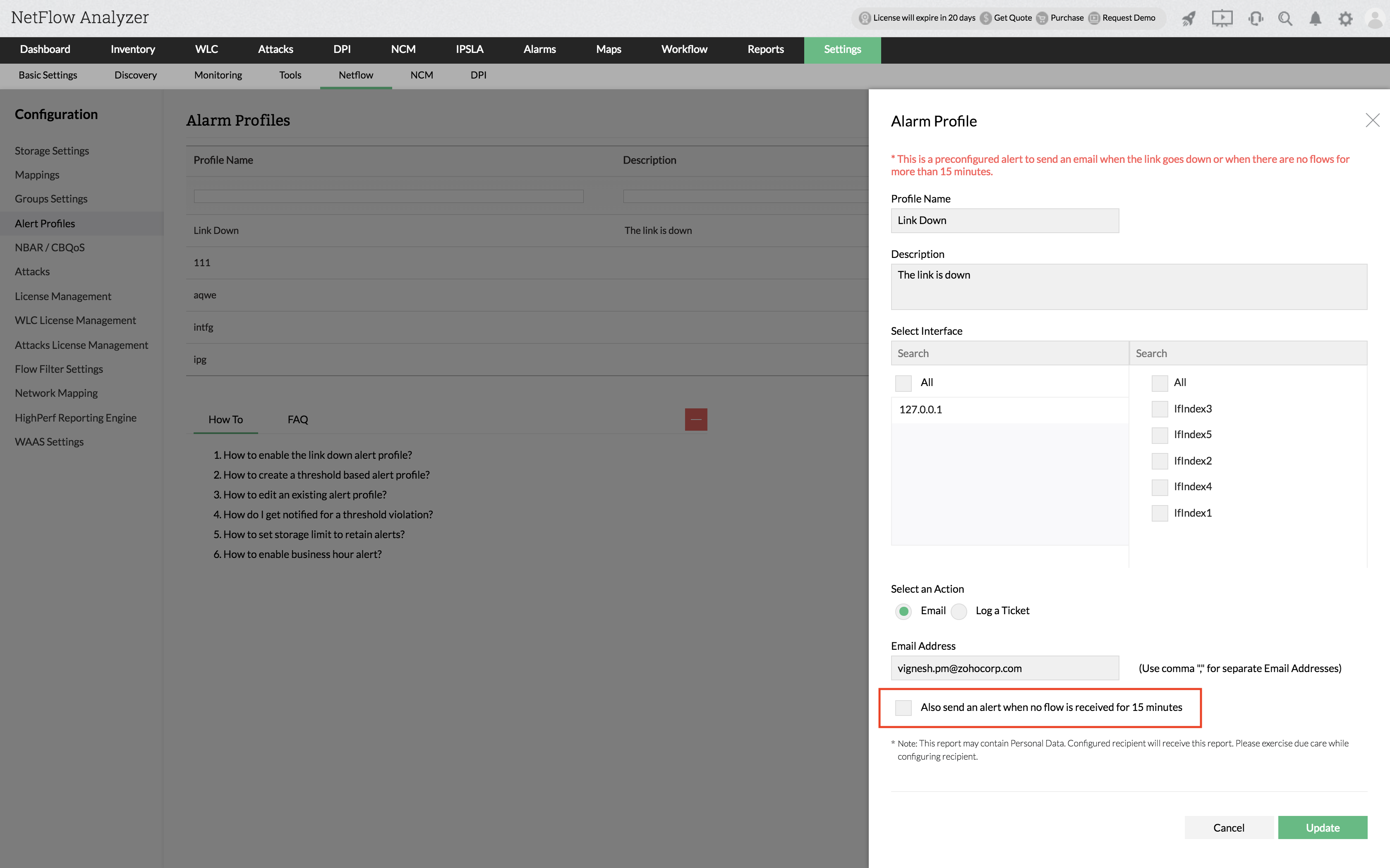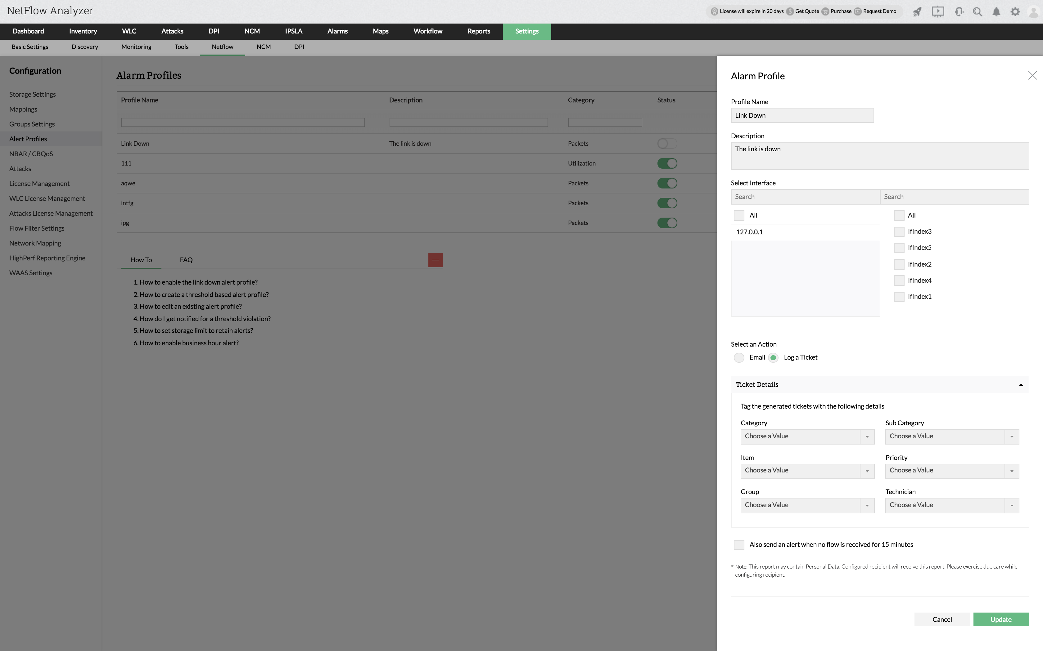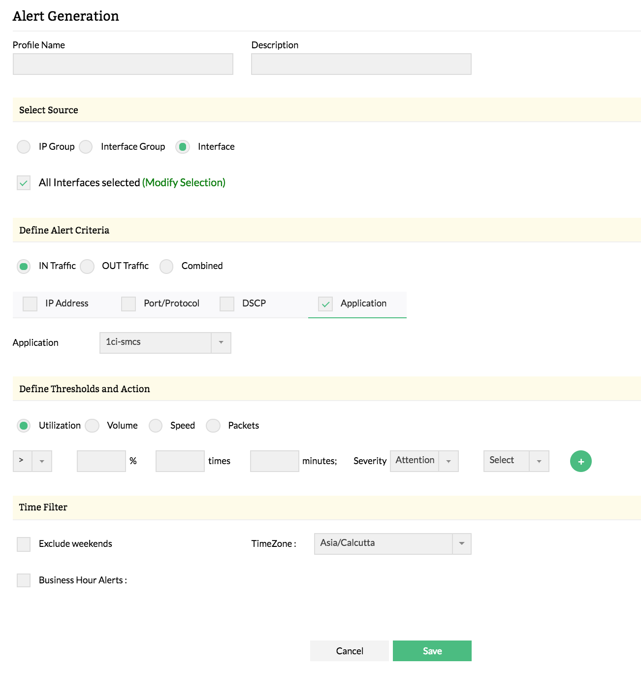 在设置 > NetFlow > 告警配置文件下,点击告警配置文件名称。修改阈值/接口选择/告警名称并“保存”。