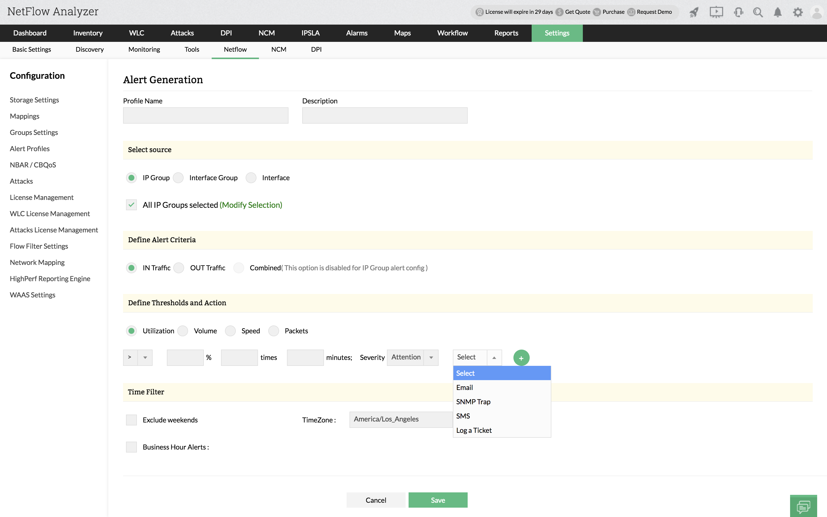 添加名称、源、条件、阈值和时间过滤器等告警详细信息后,将告警类型设置为