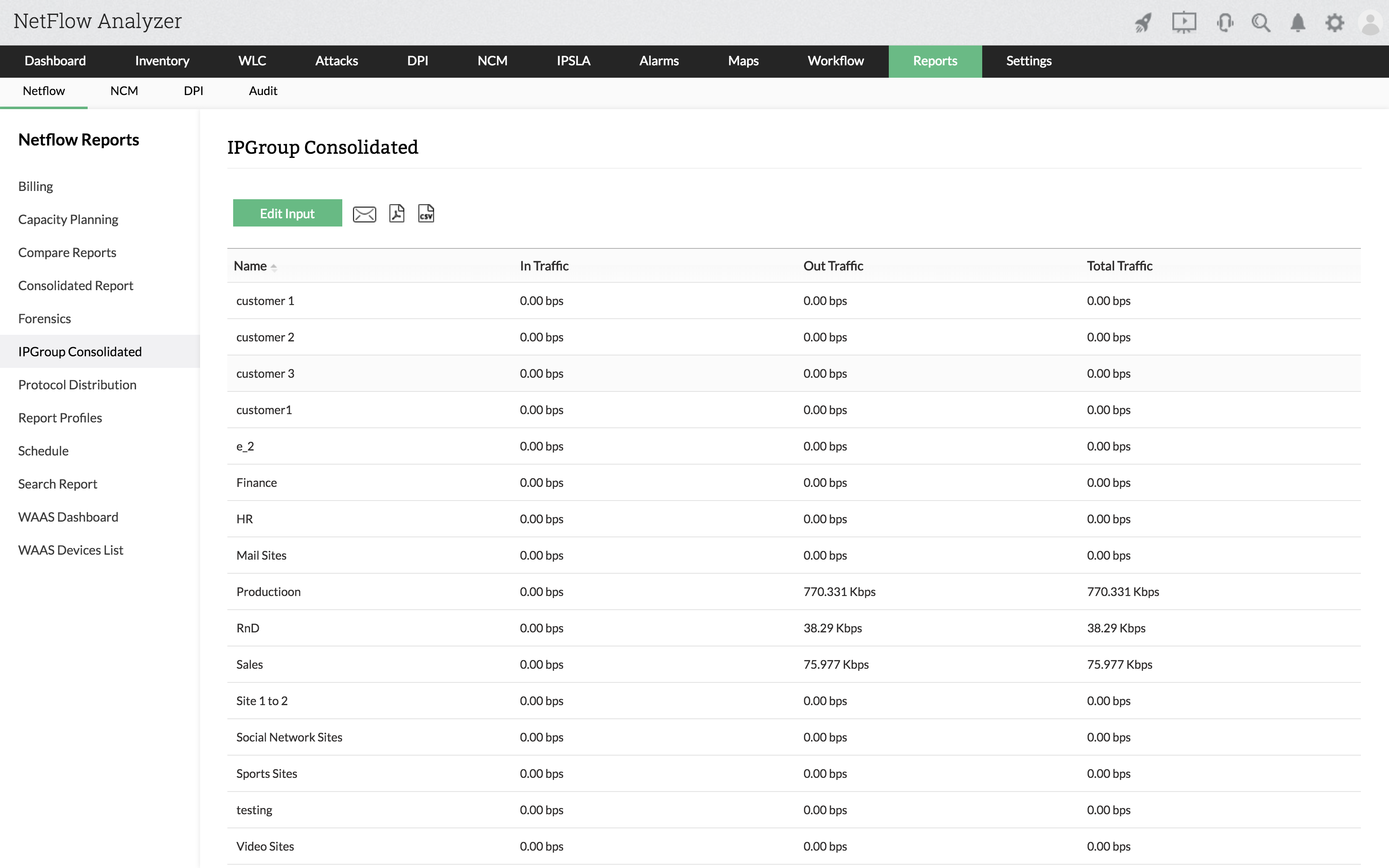 IP组综合报表显示您在NetFlow Analyzer中创建的IP组的综合信息以及基于速度、容量或使用情况的进、出带宽利用率。