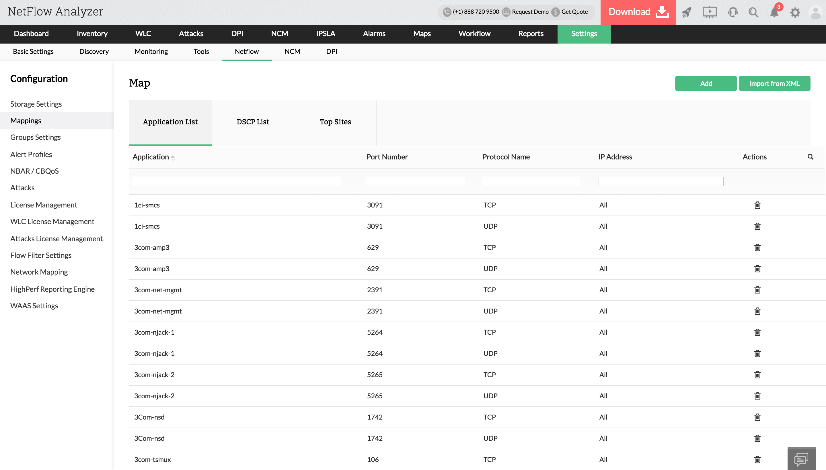 应用程序映射 选项允许您配置NetFlow Analyzer标识的应用程序。 您可以添加新应用程序,修改现有应用程序或删除它们。请参考 有关应用程序映射的附加说明 部分了解此功能的更多信息。 还可以将IP地址与应用程序相关联。