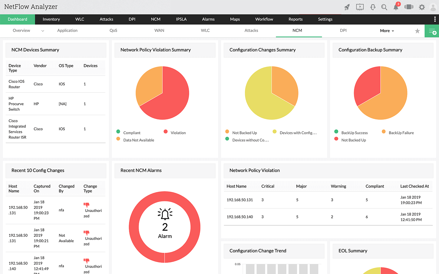 Network Configuration Manager是一个NCCM(网络配置及合规性管理)工具,可进行配置备份、将配置推送到设备,还可以对设备进行合规性检查等等。此视图提供了有关设备及其配置和合规性状态的快速视图,其中包含不同的窗件: