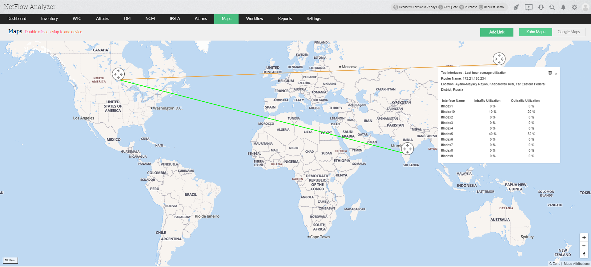 可以使用Zoho地图或Google地图创建网络映射。通过网络映射,您可以查看链接状态(正常-绿色,正常但没有flow-橘色和停止-黑色)和设备详细的利用率。